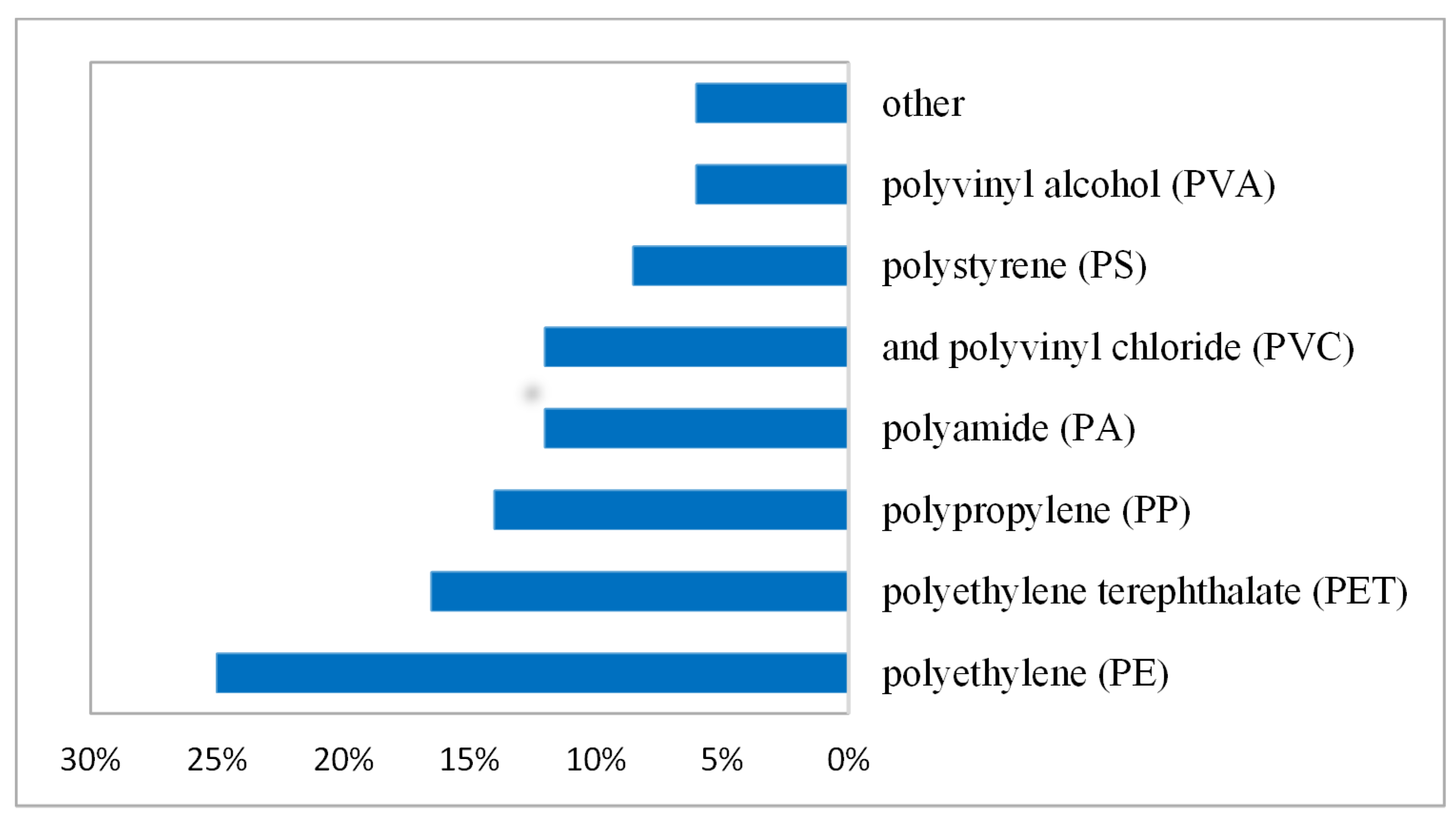 | Marine environment | PE, PP dominate surface; denser polymers at depth | Surface ocean: PE ~42%, PP ~25% Deep Sea: PE and PP ~2–3% | [99] |