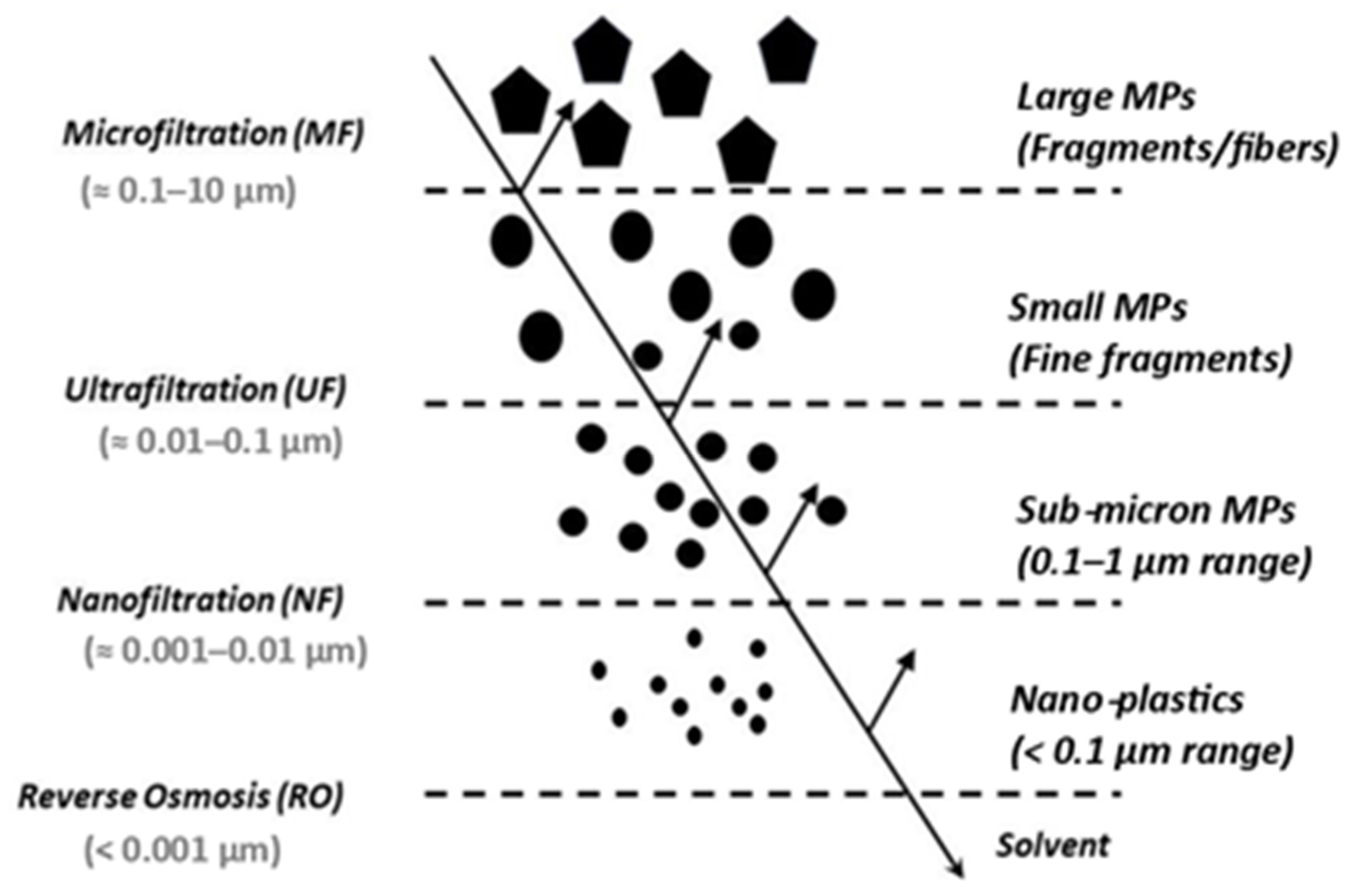 | UF | 0.01–0.1 | 1–10 | Colloids, bacteria, larger MPs | Sieving, adsorption | High (~90–97%) | [130,131,132,133] |