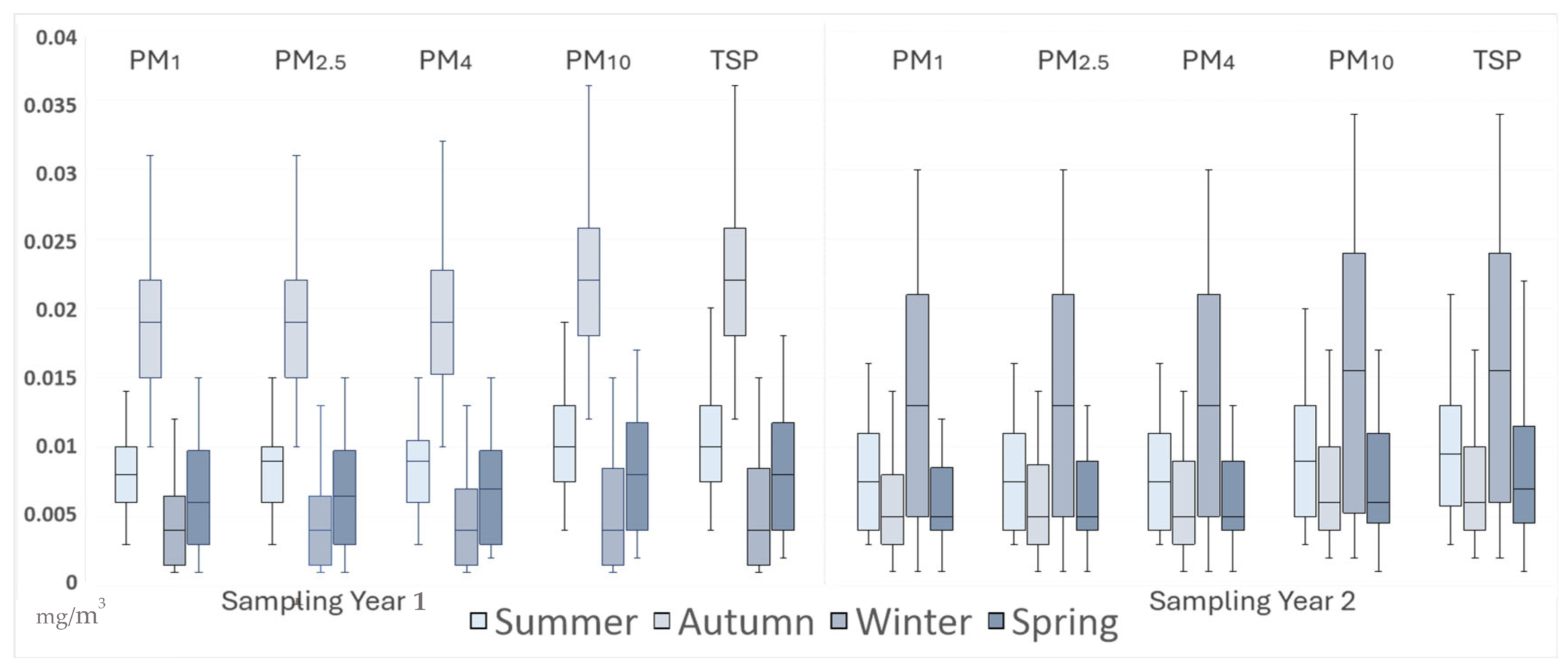 Our results showed a clear seasonal variation in PM concentration across all monitored particle sizes. In the first year, mean and maximum values were higher in autumn, whereas in the second year, winter exhibited the highest levels, suggesting additional emissions during these seasons, with the possible origin from biomass burning and low boundary layer height promoting greater mixing of particles and enhanced deposition [