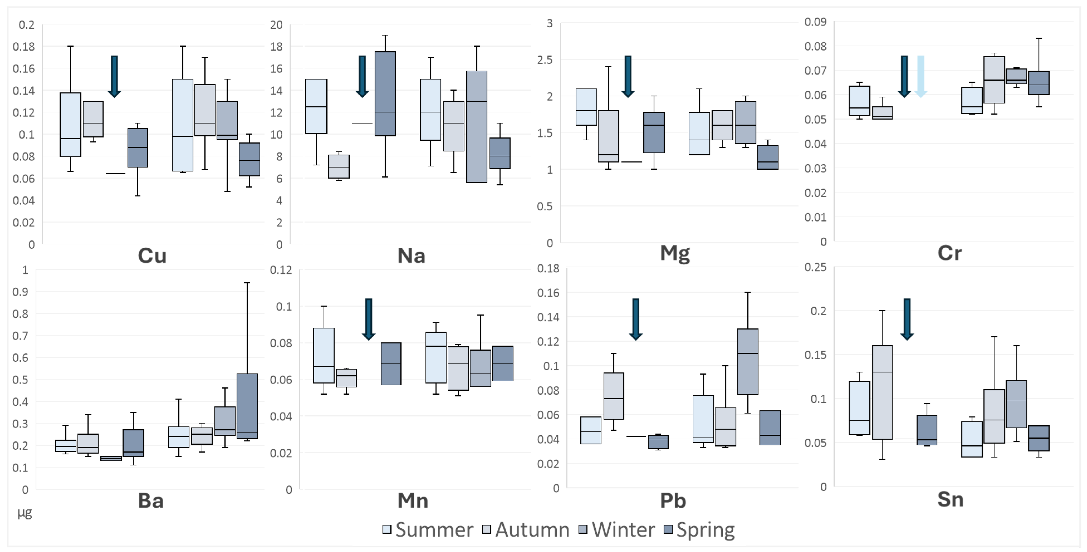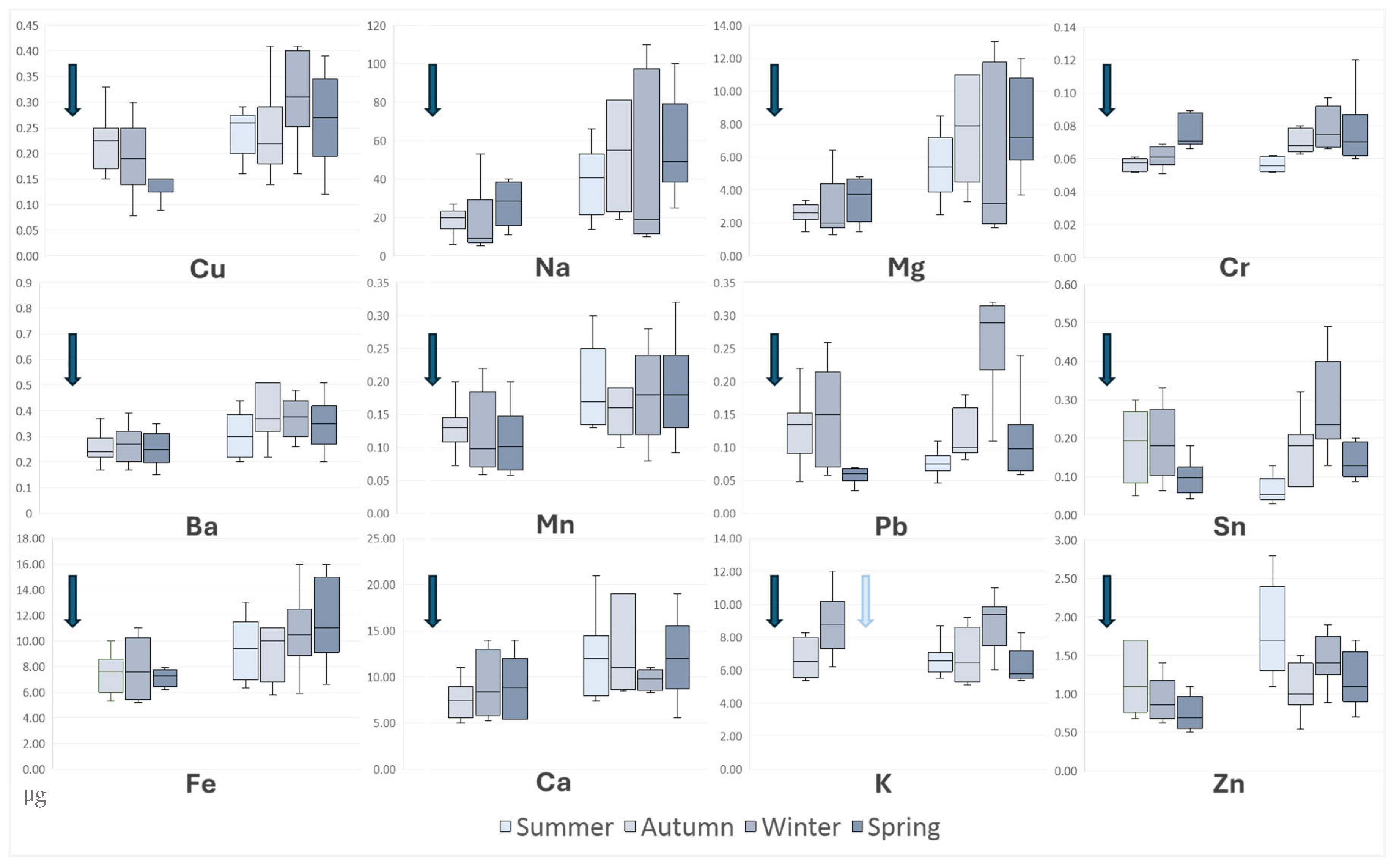 Focusing on the first sampling period, elements such as Cu, Zn, and Sn displayed decreasing trends across seasons. In contrast, concentrations of Ca, K, and Cr increased over the same periods. Na, Mg, and Mn tended to have lower average concentrations during winter and higher concentrations in spring, while Pb exhibited the opposite trend. Fe and Ba showed relatively stable average concentrations across all seasons.