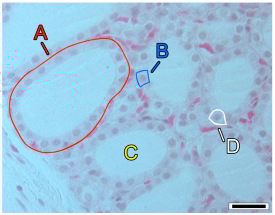 Histological section of the thyroid tissue of a wild mouse (Mus musculus L., 1758). Labels: A = follicle; B = thyrocyte (or thyroid follicular cell); C = colloid; D = C cell (or parafollicular cell). Hematoxylin and eosin stain; scale bar = 25 µm; photomicrograph by N. M. P. Coelho.