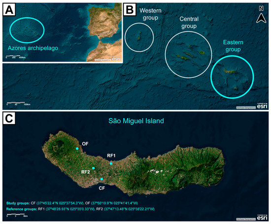 Map of the Azores archipelago showcasing (A) its location in the Atlantic Ocean, (B) its geographical groups, and (C) São Miguel Island and study sites. Study groups = conventional farming (CF), and organic farming (OF) agricultural areas; Reference groups = small village area (Rabo de Peixe, RF1), and pristine area (Pinhal da Paz, RF2), without agricultural practices. Basemap aerial view backgrounds obtained from ESRI ArcGIS online v2.3: “World Imagery” [basemap], “World Imagery Map”. Last updated on November 2024. https://www.arcgis.com/home/item.html?id=10df2279f9684e4a9f6a7f08febac2a9 (most recently consulted on 10 December 2024). Attribution to ESRI and other data providers is present in the figure.