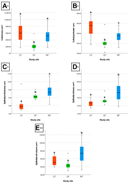 Box plots of the (A) colloid area, (B) colloid perimeter, (C) epithelium thickness, (D) epithelial cell area, and (E) epithelial cell volume of the male and female wild mice (Mus musculus L., 1758) sourced from conventional farming (CF), organic farming (OF), and reference (RF’) sites. * H-test; ** F-test; different letters (a, b, and c) indicate significant differences (p < 0.05). The line in the middle of each box plot represents the median of the respective group; error bars are shown; an asterisk within the graphs indicates a group outlier.