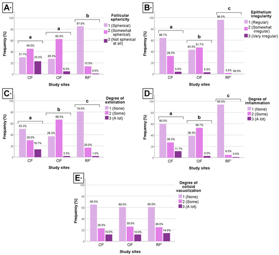Clustered bar charts of the (A) follicular sphericity, (B) epithelium irregularity, (C) degree of exfoliation, (D) degree of inflammation, and (E) degree of colloid vacuolization of the male and female wild mice (Mus musculus L., 1758) sourced from conventional farming (CF), organic farming (OF), and reference (RF’) sites. * H-test; different letters (a, b, and c) indicate significant differences (p < 0.05); relative frequencies per category per group are shown.