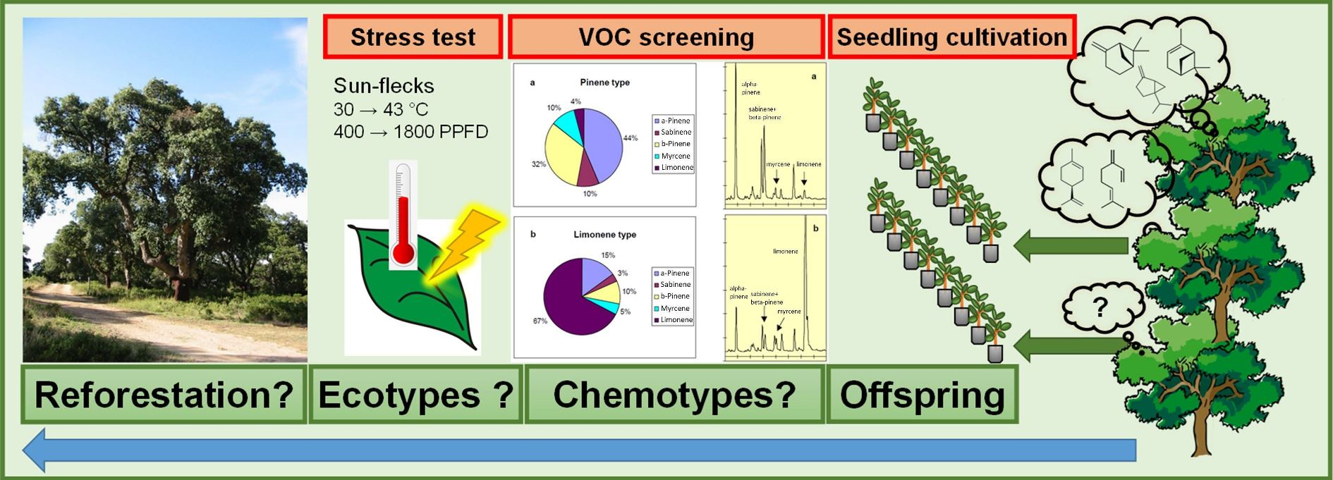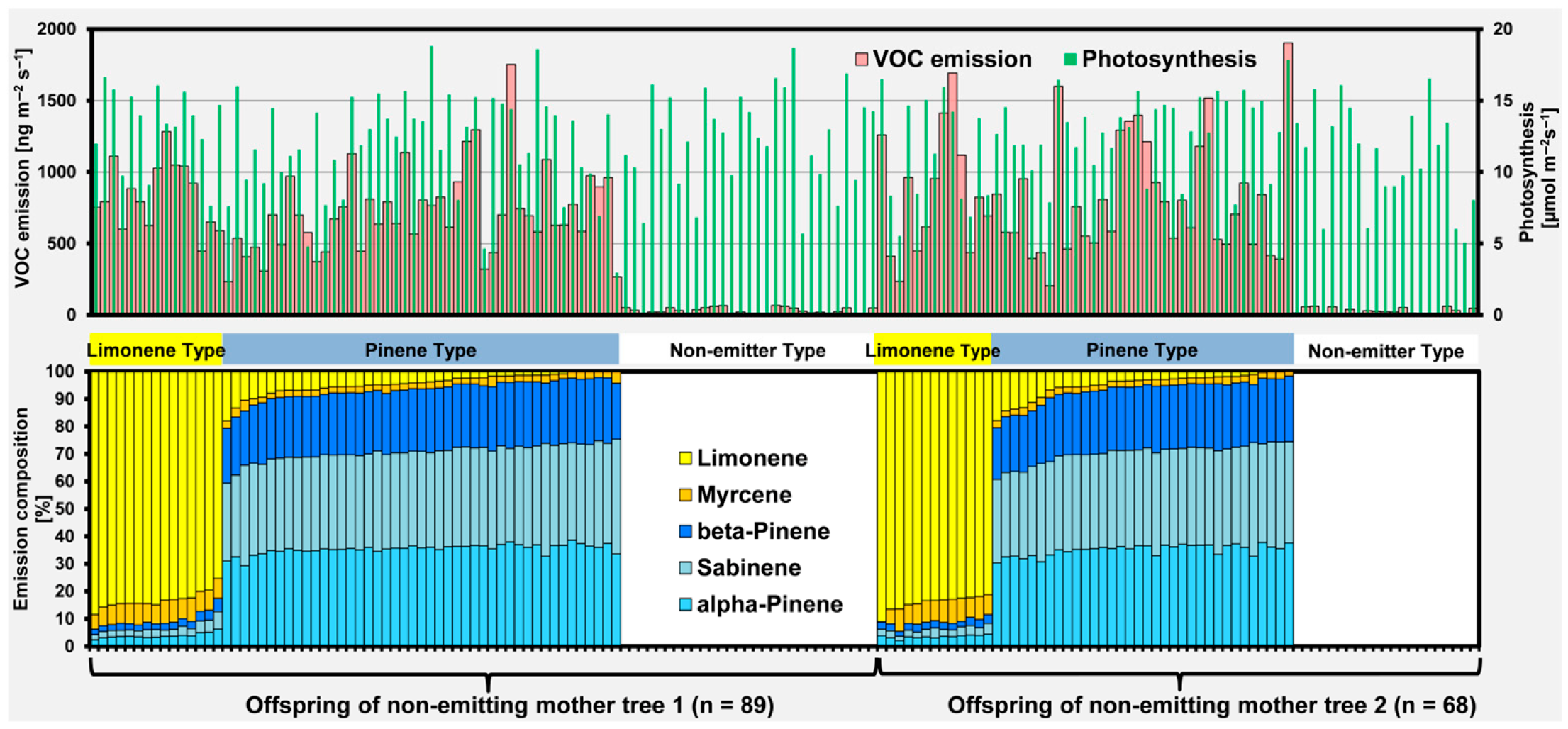 | Descendants/Chemotype | VOC Emission | Photosynthesis | C-Loss | Transpiration | GH2O | WUE | LMA | Chlorophyll Content | Foliage Mass | Ramification | Budburst |