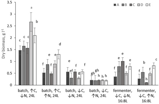 Biomass yield of microalgal strains (A–E) grown under different conditions over 14 days. Different lowercase letters above bars denote statistically significant differences for each strain (p < 0.05, Mann–Whitney U test). Conditions sharing a common letter within the same strain are not significantly different.