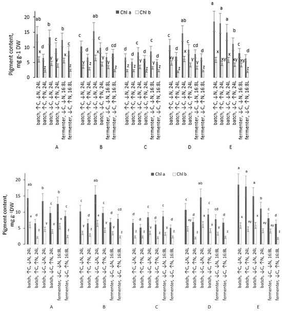 Across the different cultivation regimes, chlorophyll a concentration ranged from 5.12 to 18.55 mg g−1 DW, while chlorophyll b ranged from 1.85 to 6.01 mg g−1 DW (Figure 2).