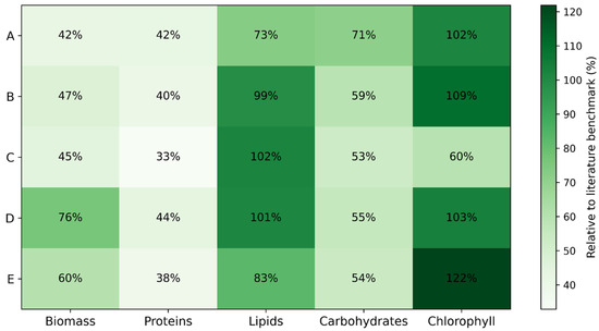 To enable a direct comparison of the bioprocess performance of the investigated strains, the experimental maxima for biomass, lipids, proteins, carbohydrates, and chlorophyll were normalized against the representative literature benchmark values, which were taken as 100% (3.5 g L−1 for biomass, 60% DW for lipids, 55% DW for proteins, 50% DW for carbohydrates, and 20 mg g−1 DW for chlorophyll). All experimental values were recalculated as percentages of these reference maxima, providing a dimensionless performance index that allows for objective benchmarking against established industrial platform strains. The resulting literature-normalized heatmap (Figure 3) highlights clear strain-specific production profiles. Strain D reached approximately 76% of the industrial biomass benchmark and exceeded the lipid benchmark (>100%), while strain E exceeded the pigment benchmark (122%) and reached 60% of the biomass benchmark. Strains B and C matched or exceeded the lipid benchmark (99–102%), confirming their strong oleaginous character, whereas proteins and carbohydrates reached moderate but industrially relevant levels (33–44% and 53–71% of benchmark, respectively).