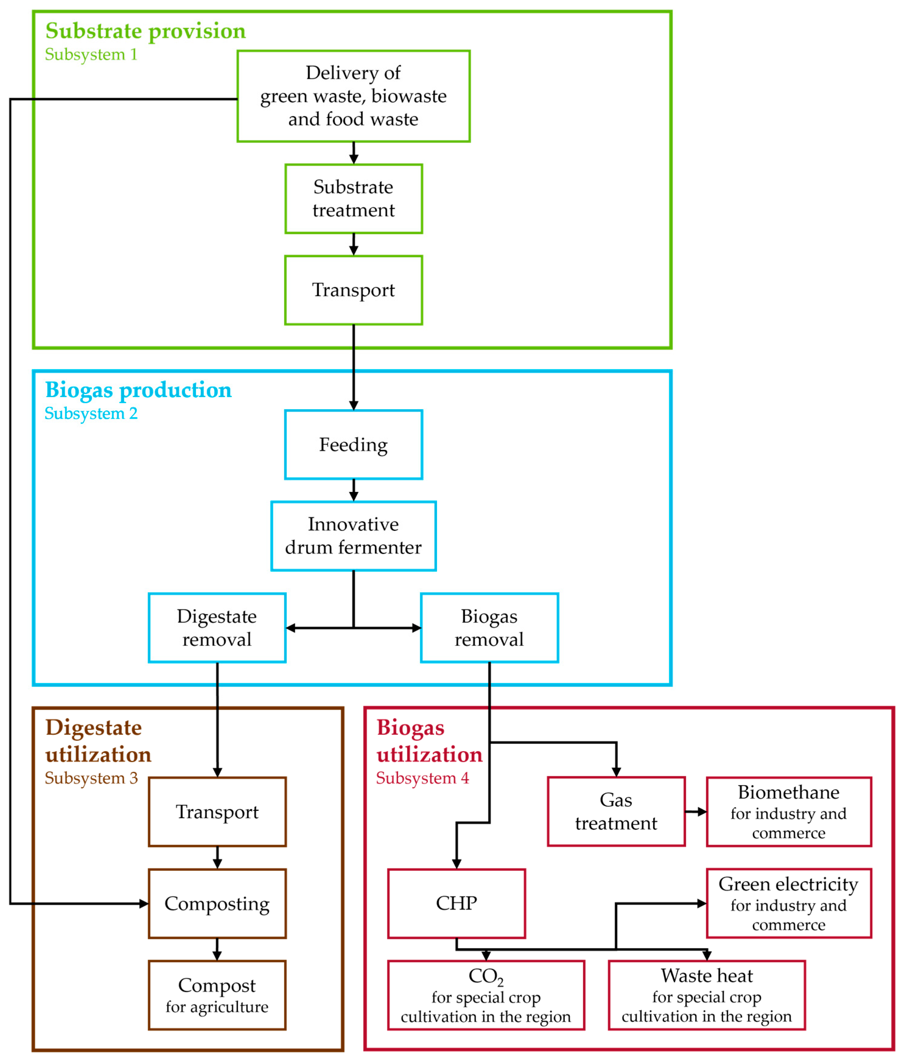 - Rosenberger, S.; Wawer, T.; Heiker, M.; Mertins, A.; Fedler, M.; Witte, A.; Große-Kracht, I. Regionalanalyse und Entwicklung von Geschäftsmodellen für Einen Post-EEG-Betrieb von Biogasanlagen auf Basis von Rest- und Abfallstoffen. Abschlussbericht, 2023. Available online: https://opac.dbu.de/ab/DBU-Abschlussbericht-AZ-34663_01-Hauptbericht.pdf (accessed on 6 August 2025).