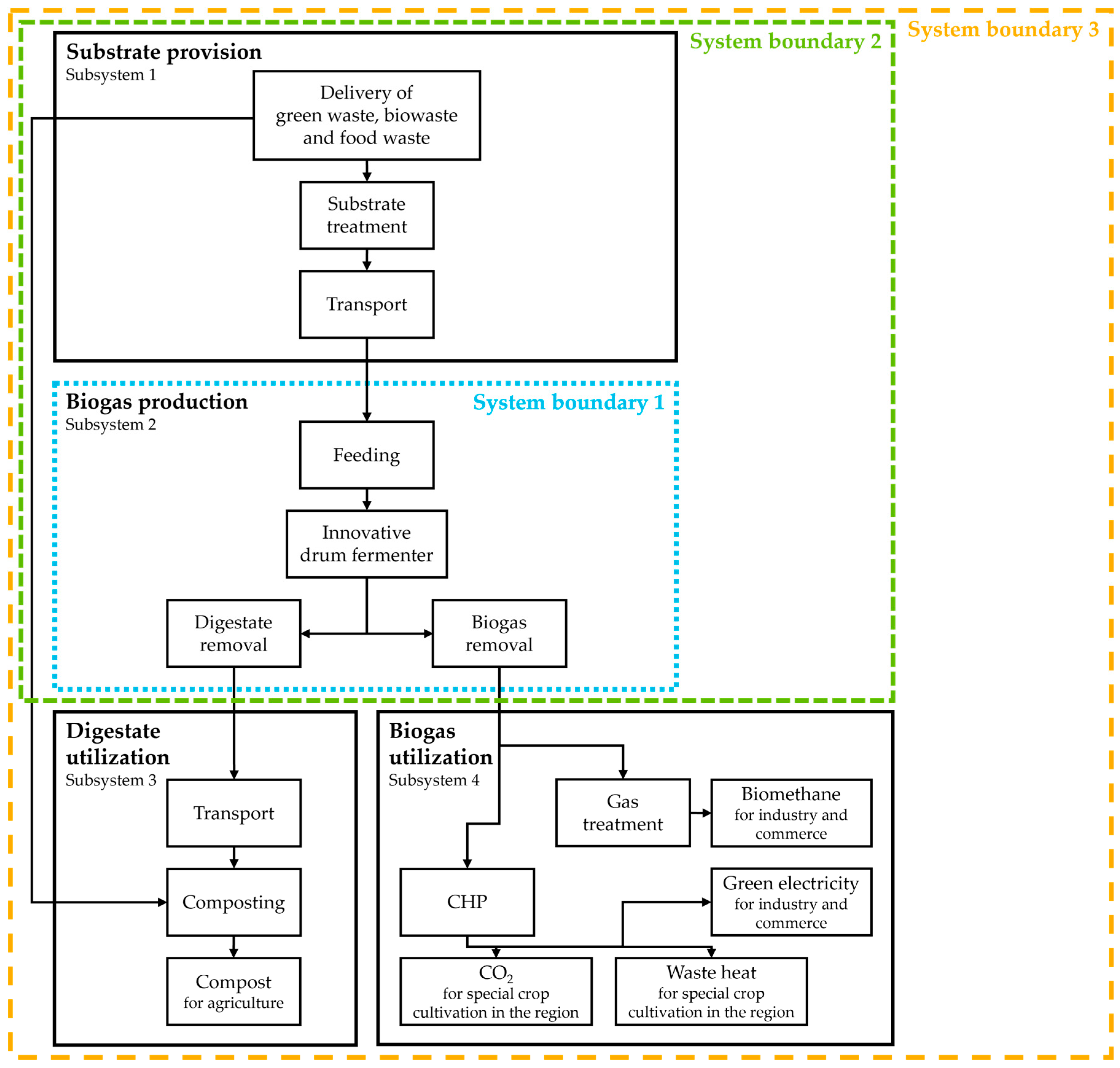 | System boundary | Processes contributing to energy generation, system expansion for digestate utilization | Holistic approach that considers all processes |