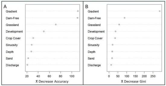 Specific evaluation rules-of-thumb have not been developed for random forest analysis, but by combining accuracy and Gini index plots (Figure 2A,B), we can create the following hierarchy for our nine regressors (most to least impactful): gradient, percent dam-free upstream area, percent grassland, development, crop cover, sinuosity, stream depth, percent sand, discharge. Of these, gradient, percent dam-free upstream area, and percent grassland were most consistently influential in our random forest model.