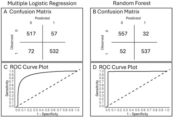 Other Complementary Analyses—Accuracy Assessment (Objective 3). Confusion matrices offer additional metrics for model accuracy (percent of true predictions in total samples). To create a confusion matrix for the multiple logistic regression model on original data, we used a 10 k-fold cross validation (caret and tidyverse, [114,115,116,117]). A confusion matrix for the random forest analysis was created post hoc using the out-of-bag error rate, i.e., the error rate of the predictions from the test datasets after being fit to the trained models [71,113]. For both analyses, receiver operating characteristic (ROC) curves, based on true and false positive rates, assisted in visualizing model performance. A ROC baseline represents no predictive power; a ROC that approaches a 100% true positive rate and 0% false positive rate identifies a better model performance.