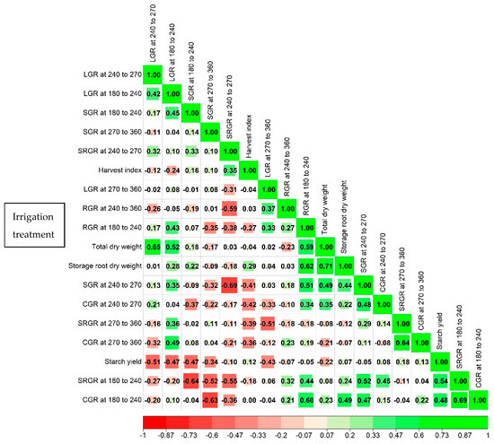 A correlation matrix of growth rates (RGR = relative growth rate, LGR = leaf growth rate, SRGR = storage root growth rate, CGR = crop growth rate, and SGR = stem growth rate) and final yield (total dry weight, storage root dry weight, starch yield, and harvest index) at 360 days after planting (DAP) of six cassava genotypes grown under irrigation treatment across the 2022/2023 and 2023/2024 growing seasons (n = 48).
