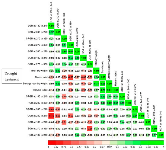 A correlation matrix of growth rates (SRGR = storage root growth rate, LGR = leaf growth rate, SGR = stem growth rate, CGR = crop growth rate, and RGR = relative growth rate) and final yield (total dry weight, storage root dry weight, starch yield, and harvest index) at 360 days after planting (DAP) of six cassava genotypes grown under drought treatment across the 2022/2023 and 2023/2024 growing seasons (n = 48).
