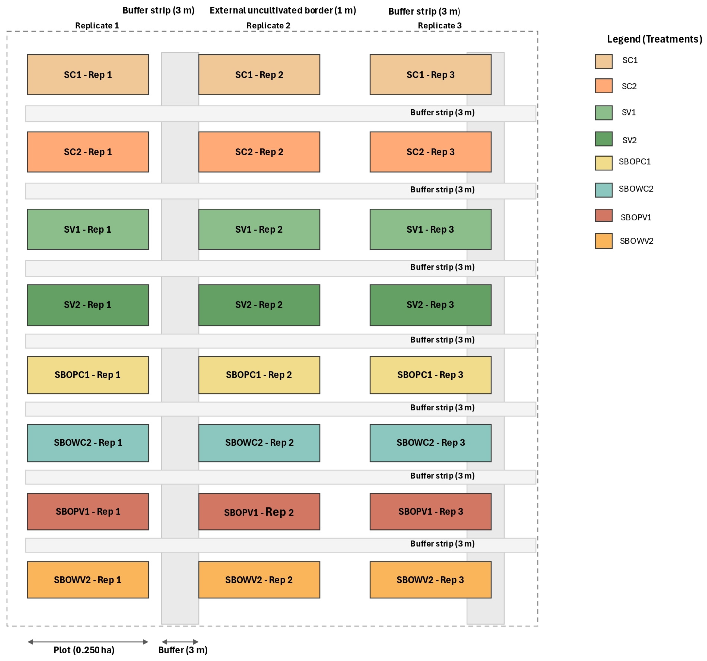 - Sulfur–bentonite plus olive pomace compost (SBOPC1) or vermicompost (SBOPV1); or sulfur–bentonite orange compost or vermicompost was used at 200 kg per 0.250 ha;