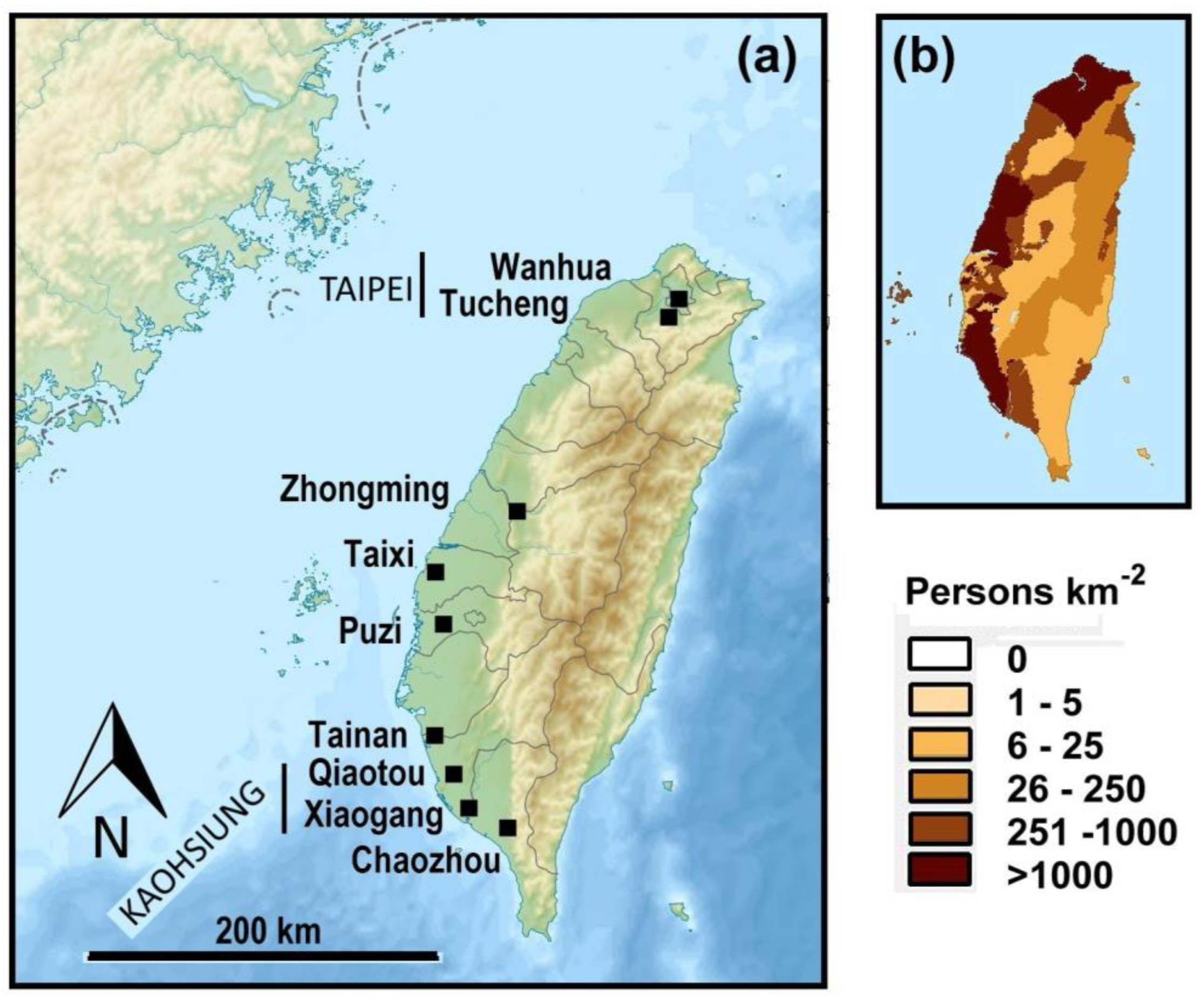 | Chaozhou | Pingtung | 22.52° N, 120.56° E | 0.83 × 106 | 1367 | A suburban area with a freeway and expressway nearby. Monitoring VOCs from scattered smaller factories and long-range transport. |