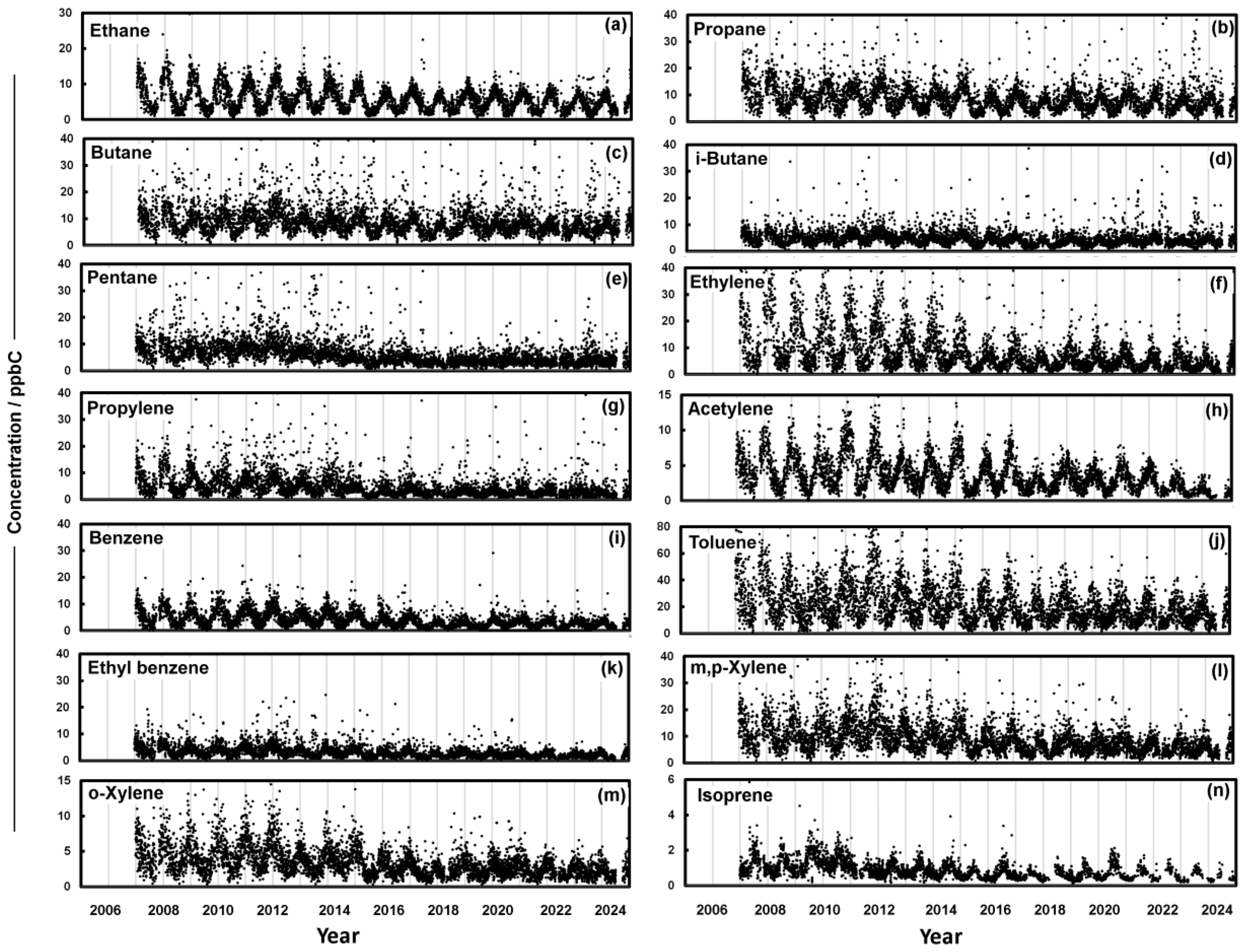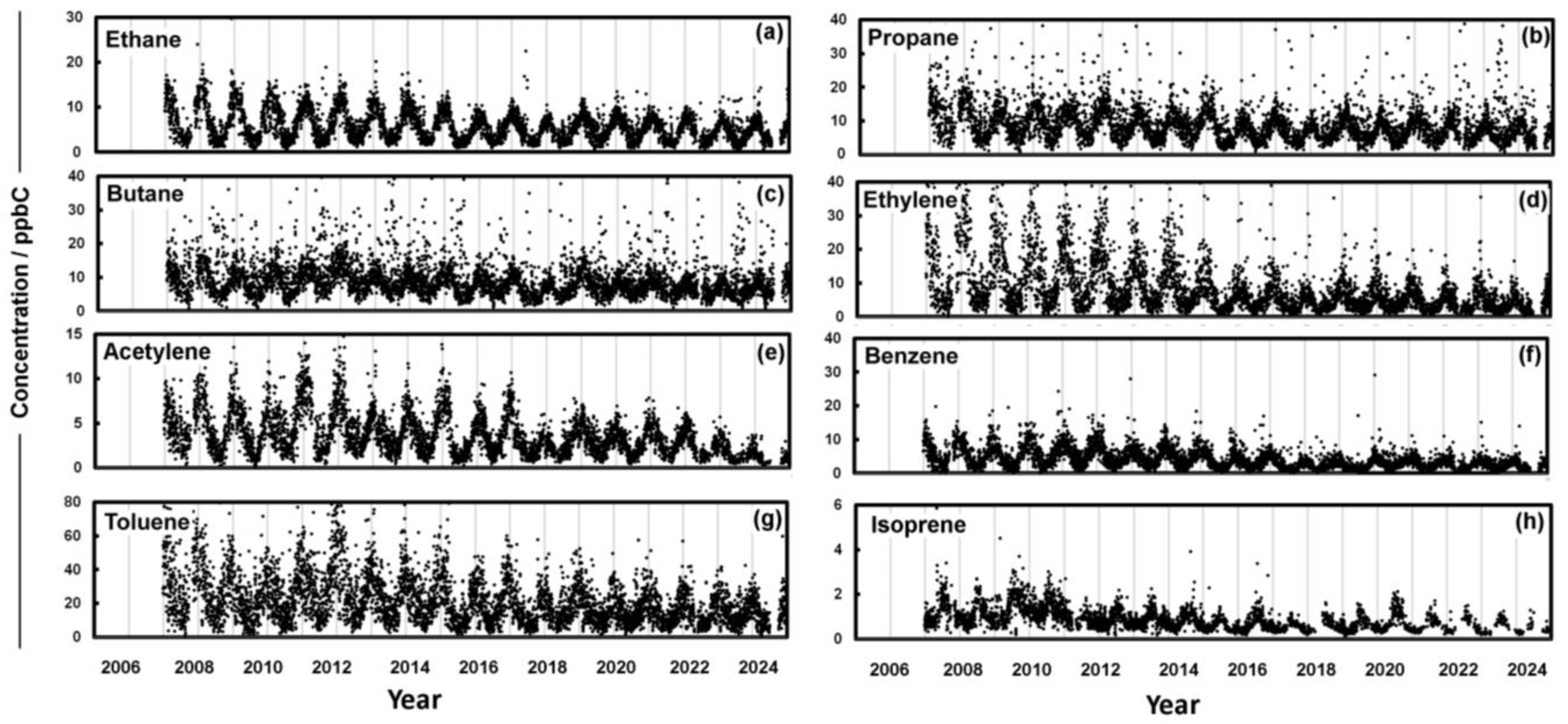 - Ou-Yang, C.-F.; Hsieh, H.; Cheng, F.; Lin, N.; Chang, S.; Wang, J. Decadal trends of speciated non-methane hydrocarbons in Taipei. J. Geophys. Res. Atmos. 2020, 125, e2019JD031578. [Google Scholar] [CrossRef]