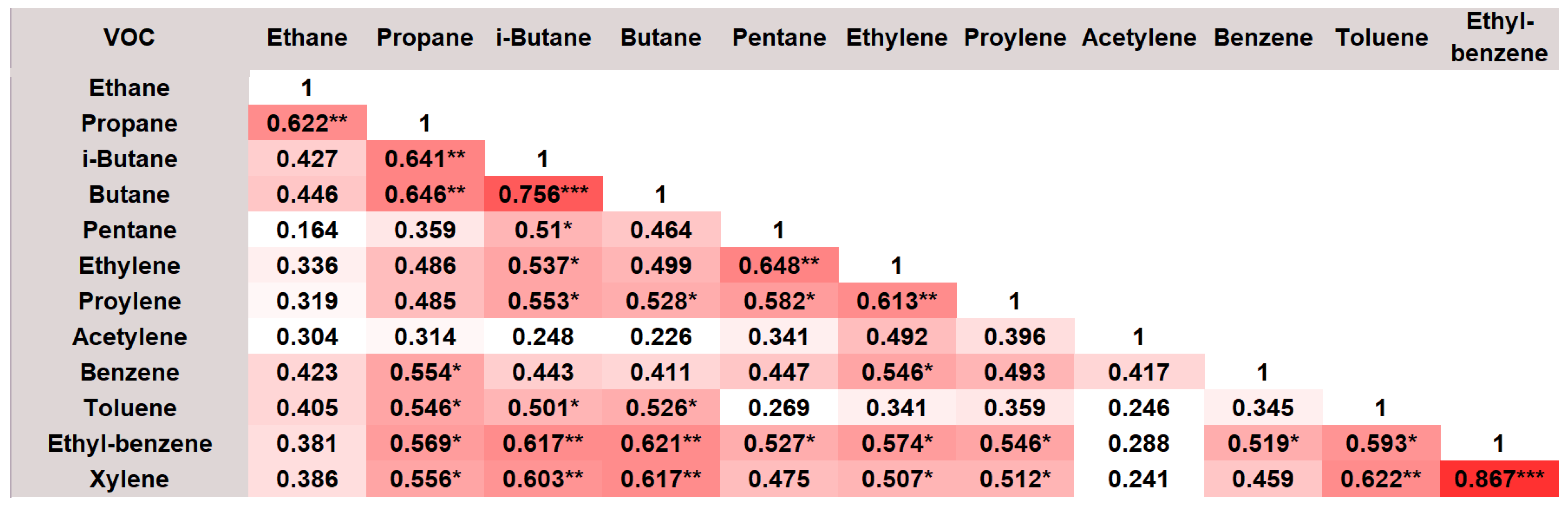 - Hsieh, C.C.; Tsai, J.H. VOC concentration characteristics in southern Taiwan. Chemosphere 2003, 50, 545–556. [Google Scholar] [CrossRef]