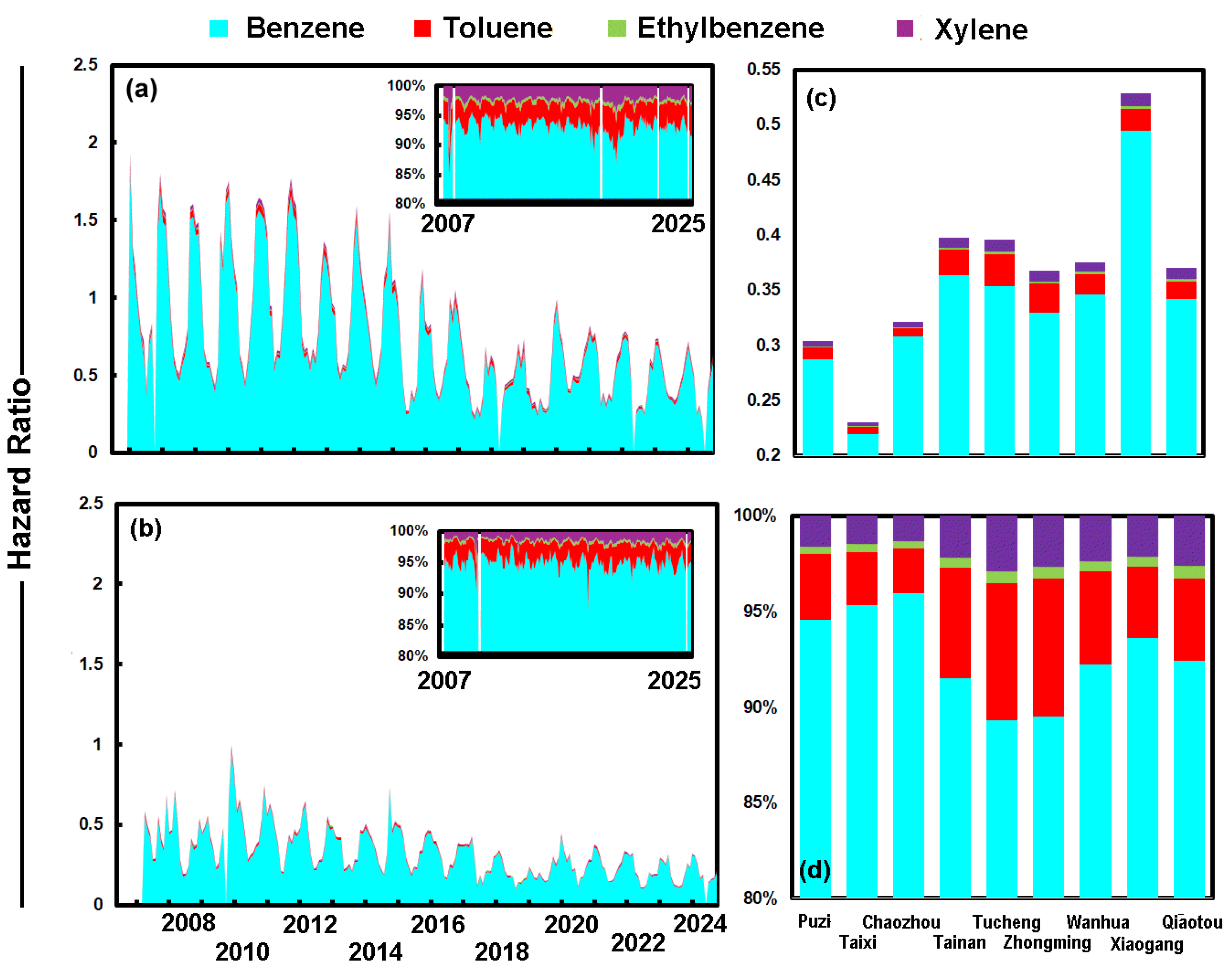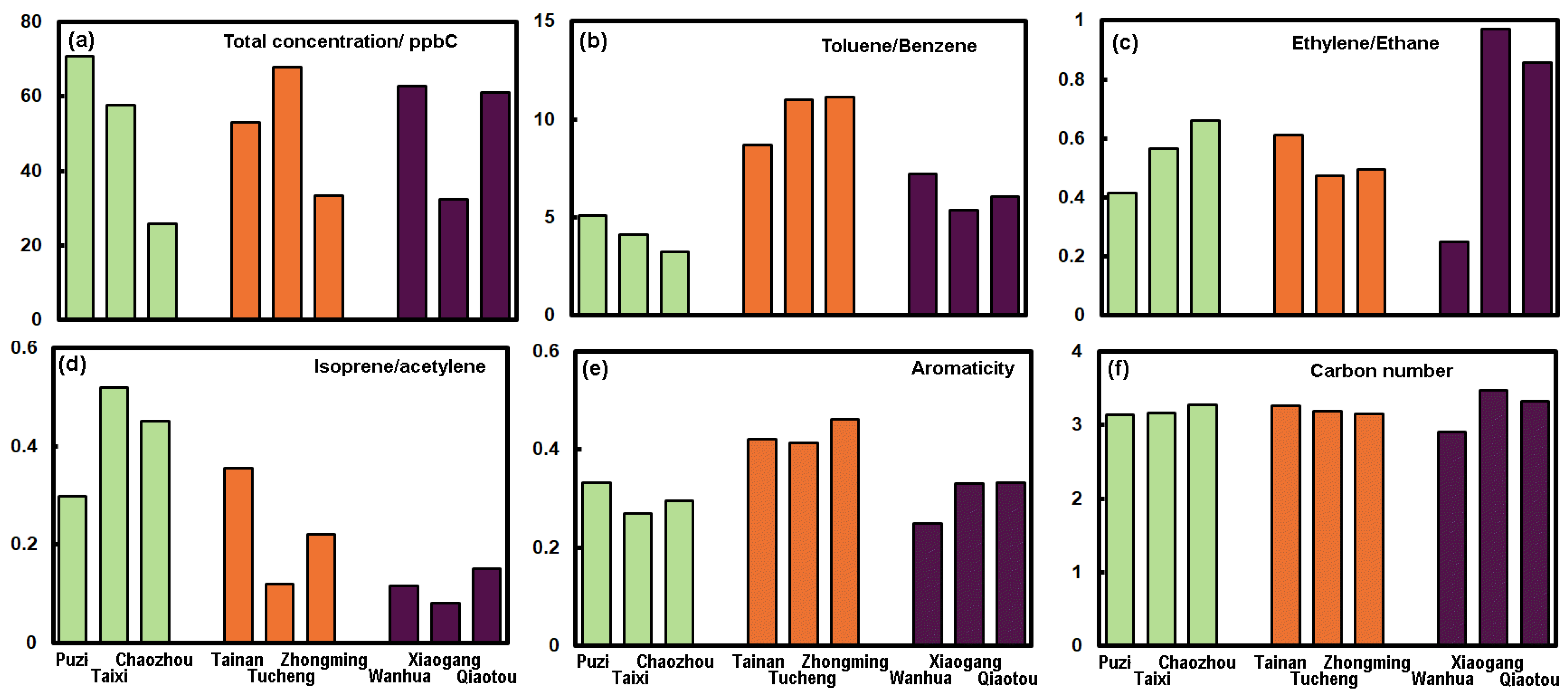| Aromatics | 13.71 (Tucheng, 18:00) | 7.83 ± 6.37 (08:00) | 4.54 ± 3.00 (13:00) | 1.66 (Taixi, 13:00) |