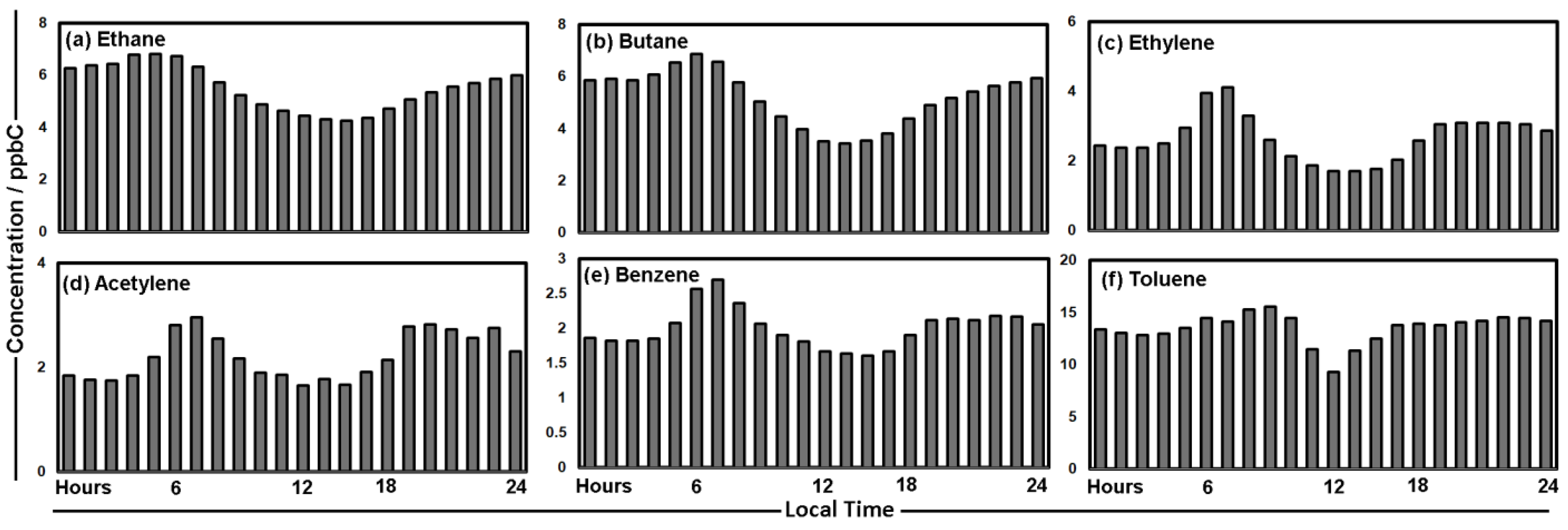 | VOC Category | Maximum/ppbC | Highest Mean/ppbC ± σ (Time) | Lowest Mean/ppbC ± σ (Time) | Minimum/ppbC |