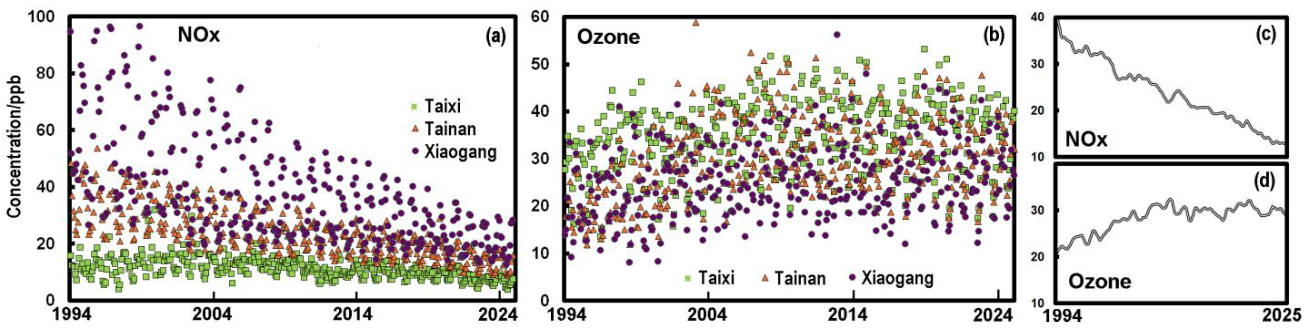 | Taixi | Yunlin | 23.72° N, 120.20° E | 0.69 × 106 | 1866 | Approximately 5 km from the coast and 7 km southeast of a major petrochemical complex, monitors VOCs influenced by industrial emissions and coastal meteorology. |