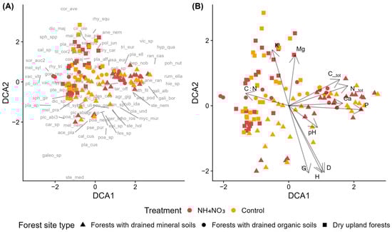 Detrended Correspondence Analysis (DCA) of species composition in control and ammonium nitrate-fertilized (NH4NO3)) plots in young Norway spruce stands across forest site types. (A) Sample plots (symbols indicate treatment and forest site type) with species acronyms shown at their optimum positions (full names in Table A2). (B) Sample plots with environmental vectors: D—mean tree diameter at breast height, G—stand basal area, H—mean tree height, C_tot—total soil carbon, N_tot—total soil nitrogen, C:N—carbon-to-nitrogen ratio, K—potassium, Ca—calcium, P—phosphorus, Mg—magnesium, and pH—soil pH (CaCl2).