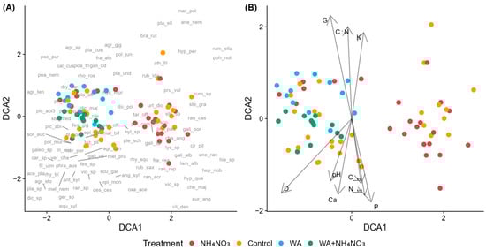 Detrended Correspondence Analysis (DCA) of species composition in control and fertilized plots in young Norway spruce stands in forests with drained mineral soils across fertilizer types. (A) Sample plots (symbols indicate treatment) with species acronyms shown at their optimum positions (full names in Table A2). (B) Sample plots with environmental vectors: D—mean tree diameter, G—stand basal area, C_tot—total soil carbon, N_tot—total soil nitrogen, C:N—carbon-to-nitrogen ratio, K—potassium, Ca—calcium, P—phosphorus, and pH—soil pH (CaCl2). Fertilizers include ammonium nitrate (NH4NO3), wood ash (WA), and the combined fertilizer (WA + NH4NO3).