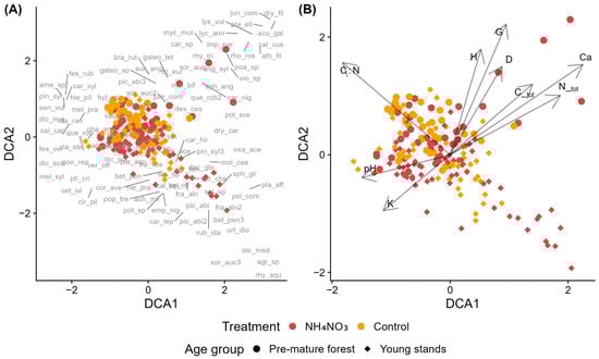 Detrended Correspondence Analysis (DCA) of species composition in control and ammonium nitrate–fertilized (NH4NO3) plots across young and pre-mature Scots pine stands. (A) Sample plots, where symbols indicate treatment (control vs. NH4NO3) and stand developmental stage, with species acronyms (full names in Table A2) shown at their optimum positions along the ordination gradients. (B) Sample plots with environmental vectors indicating significant correlations with the ordination axes: D—mean tree diameter, G—stand basal area, H—mean tree height, C_tot—total soil carbon, N_tot—total soil nitrogen, C:N—carbon-to-nitrogen ratio, K—potassium, and Ca—calcium, and pH—soil pH (CaCl2).