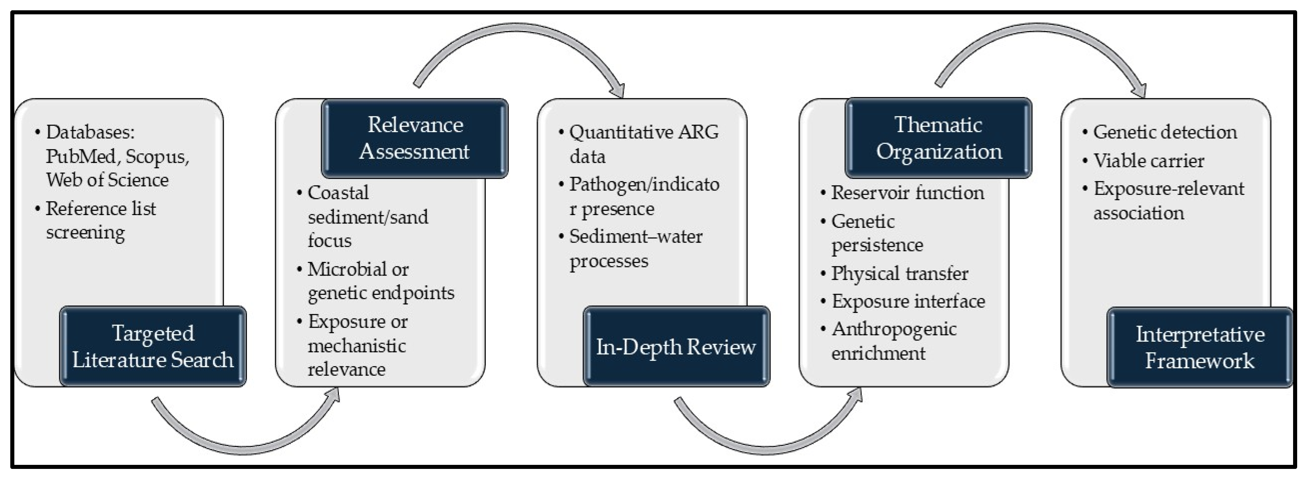 | Exposure-relevant association | Associations between environmental contact and health outcomes | Epidemiological studies, exposure assessments | Evidence of exposure pathways linking sand or sediment contact to illness | Attribution of specific genes or strains as causal agents |