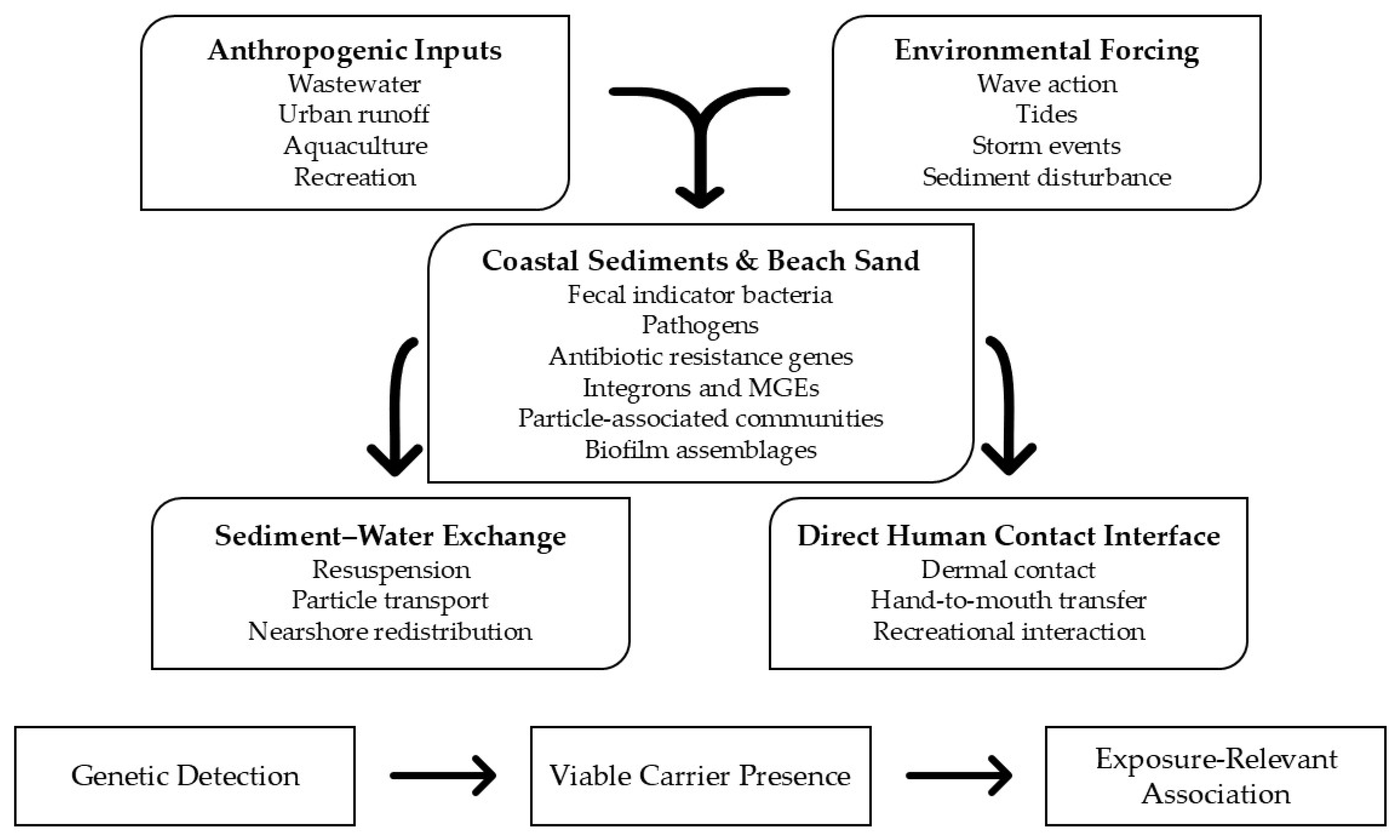 | Viable carrier | Intact microorganisms harboring resistance or virulence determinants | Culture-based methods, viability-PCR, microscopy | Persistence of viable organisms within sediments or sands | Exposure dose, transmission probability, disease outcome |