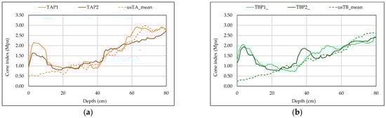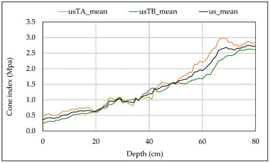 Figure 4 shows the average cone index profiles us_mean_TA and us_mean_TB, (each resulting from eight measurements) observed, respectively, in the plots designated to host the TA and TB tests and the overall profile of the test field (us_mean) defined by the average of us_mean_TA and us_mean_TB. Although the trend of the three profiles is similar, it can be noted that us_mean_TA follows a higher trajectory than us_mean_TB, particularly in the depth layers of 0–25 cm and >50 cm. This trend is consistent with the minor differences observed in the average cone index and void ratio values measured across the TA and TB plots, as reported in Table 7.