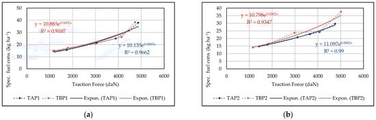 - Figure 7 and Figure 8: Curves and exponential regression functions of the specific fuel consumption per hectare of area, Csha, as a function of the traction force;