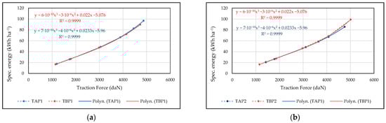 Figure 11. Overall specific energy (traction + slip losses, Etha) per hectare of surface against tractive force. (a) Comparison between TA and TB at P1; (b) comparison between TA and TB at P2.