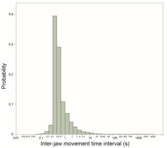 The frequency distribution of the time interval (seconds; logarithmic scale) between successive jaw movements performed along 69 daily foraging routes traversed over the course of an annual cycle, spanning a green season (23 routes) and a dry season (46 routes). The distribution is based on a total of 877,349 intervals.