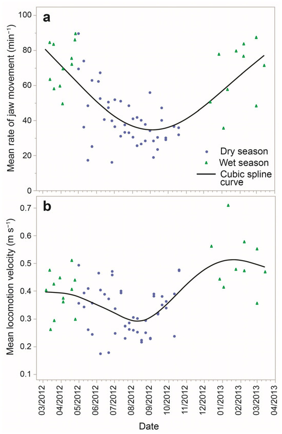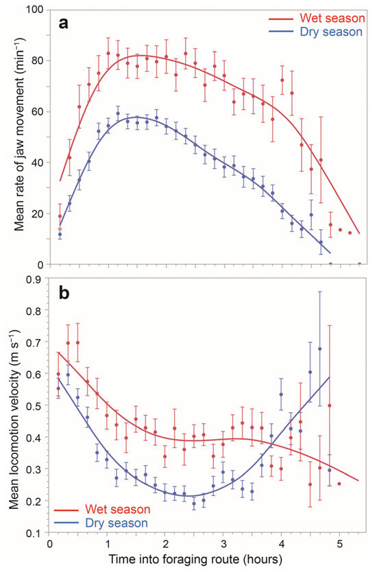 Daily mean rates of jaw movement (a) and locomotion velocity (b) for 69 foraging routes sampled over the course of one year, spanning wet and dry seasons.
