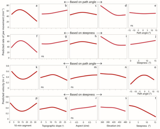 Cubic spline curves of predicted values for rate of jaw movement (upper 2 rows) and velocity (lower 2 rows) versus selected continuous covariates in the selected models, based on 10 min-level data. For each panel, the lambda coefficient of the spline function was set to 50, which had the minimal inflections that fit the broad trend in the data. (a) the predicted rate of jaw movement according to 10-min segment (based on path angle); (b) the predicted rate of jaw movement according to topographic slope (based on path angle); (c) the predicted rate of jaw movement according to aspect (based on path angle); (d) the predicted rate of jaw movement according to elevation (based on path angle); (e) the predicted rate of jaw movement according to path angle; (f) the predicted rate of jaw movement according to 10-min segment (based on steepness); (g) the predicted rate of jaw movement according to topographic slope (based on steepness); (h) the predicted rate of jaw movement according to aspect (based on steepness); (i) the predicted rate of jaw movement according to elevation (based on steepness); (j) the predicted rate of jaw movement according to steepness; (k) the predicted velocity according to 10-min segment (based on path angle); (l) the predicted velocity according to topographic slope (based on path angle); (m) the predicted velocity according to aspect (based on path angle); (n) the predicted velocity according to elevation (based on path angle); (o) the predicted velocity according to path angle; (p) the predicted velocity according to 10-min segment (based on steepness); (q) the predicted velocity according to topographic slope (based on steepness); (r) the predicted velocity according to aspect (based on steepness); (s) the predicted velocity according to elevation (based on steepness); (t) the predicted velocity according to steepness. Non-significant relationships are indicated by “ns”.