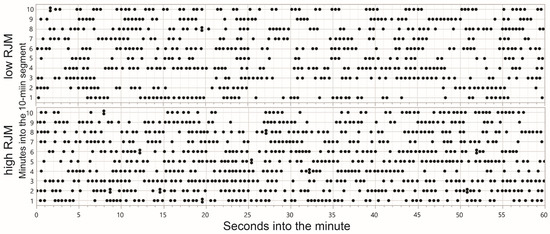 The dominant JM frequency of active grazing can be inferred from the sharply peaked frequency distribution of TI (Figure 1), with a global median in the region of 0.5 s implying an instantaneous RJM of 120 min−1. As corroboration, this rate aligns well with the relationship between the body mass and masticatory cycle period in mammals collated by Druzinsky [49] and corresponds to a body mass of 50 kg, which is representative for the herds in the northern Negev. Yet, when defined at the 1 min level, only 3% of RJMs exceeded 120 min−1. This suggests a single, relatively-high, natural frequency for the rhythm of active jaw activity (comparable to the “chewing frequency” of Virot et al. [50]) that is fractured and fragmented with interruptions of variable length, as opposed to a sustained rhythmic pattern of jaw activity at a lower frequency. This is visualized (Figure 6) by comparing the timeline of JM events for contrasting 10 min segments of a single foraging route.