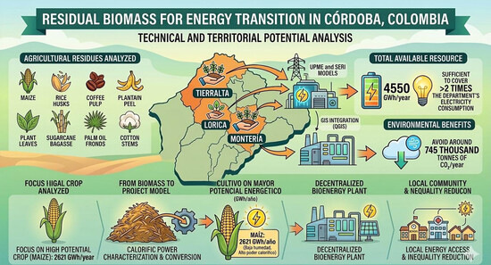 Not only does the estimated energy potential from agricultural residual biomass in the department of Córdoba (4550.76 GWh/year) represent a technical opportunity to diversify the regional energy matrix, but it also has significant implications in terms of energy sovereignty and environmental sustainability.