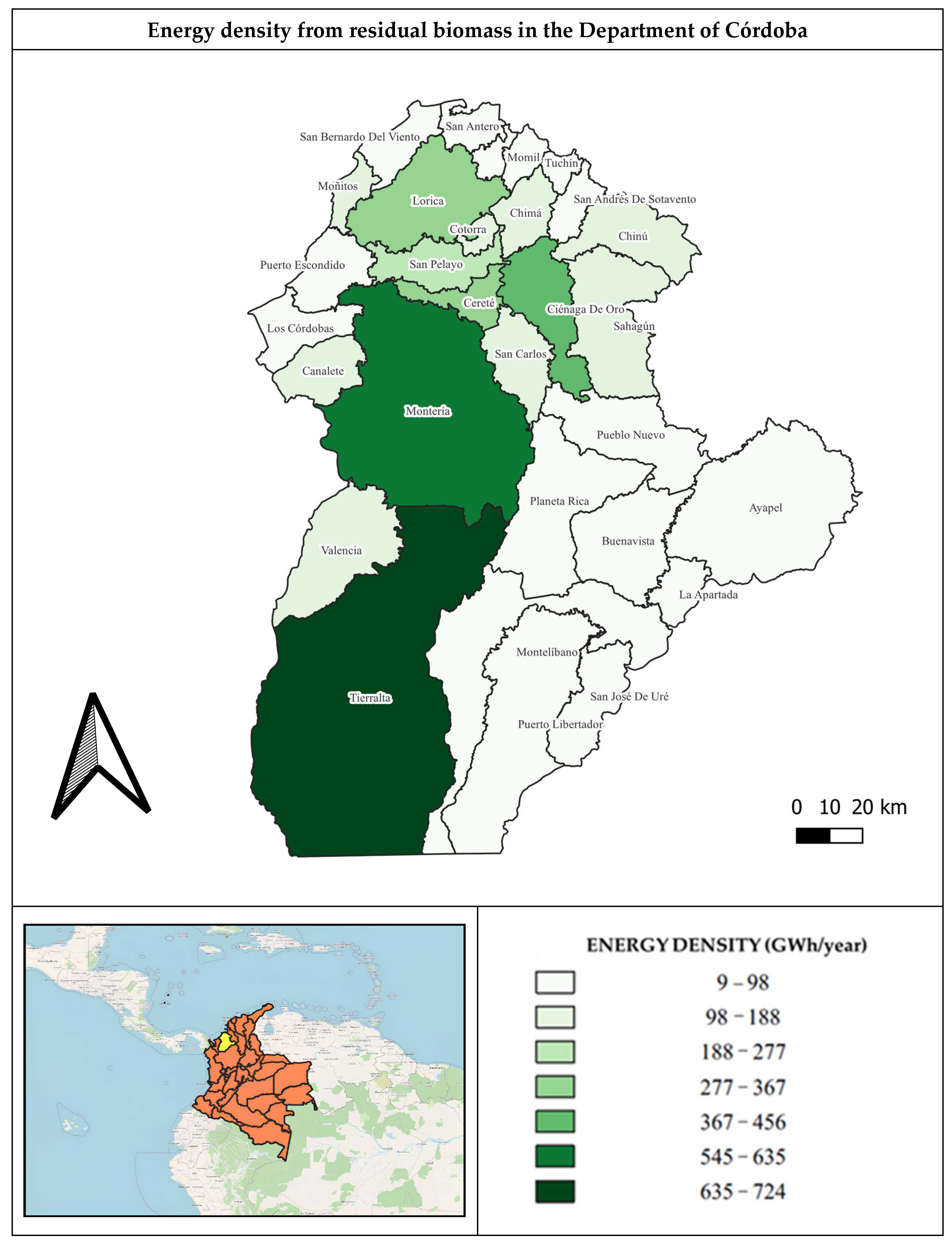 The results enabled us to accurately visualise the distribution of energy resources by municipality, identifying Tierralta, Lorica and Montería as areas with the highest energy density. Furthermore, it was demonstrated that under certain scenarios, this resource could make a significant contribution to regional energy coverage, thereby aligning with the goals of energy transition, rural development, and sustainability.