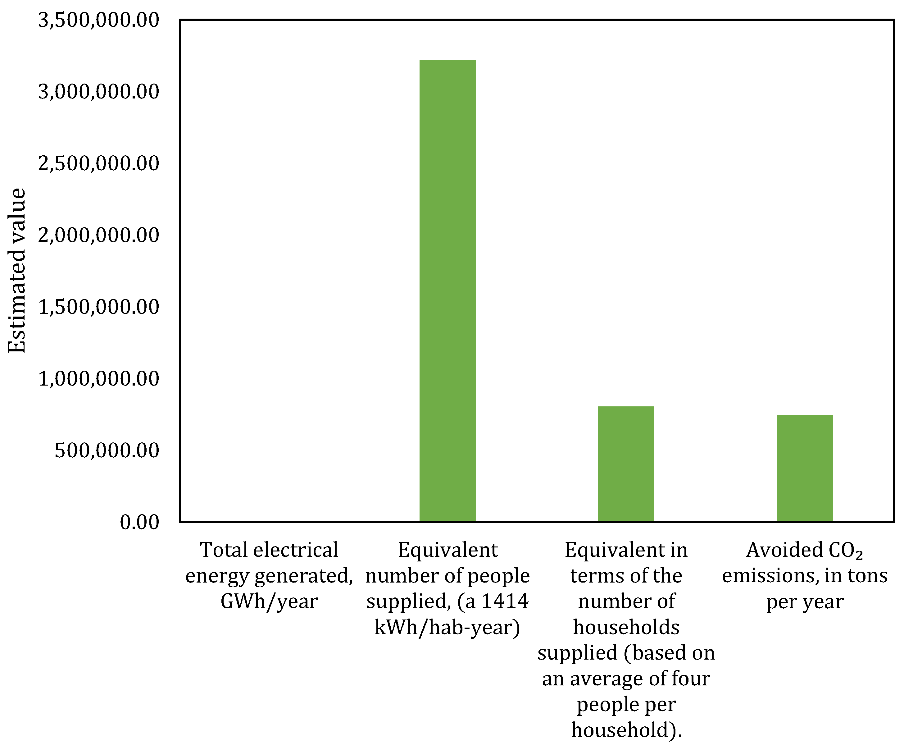 Given that the per capita electricity consumption in Colombia was approximately 1414 kWh/inhabitant/year in 2020, the total energy that could be generated would be sufficient to supply 3,217,564 people with electricity, as illustrated in