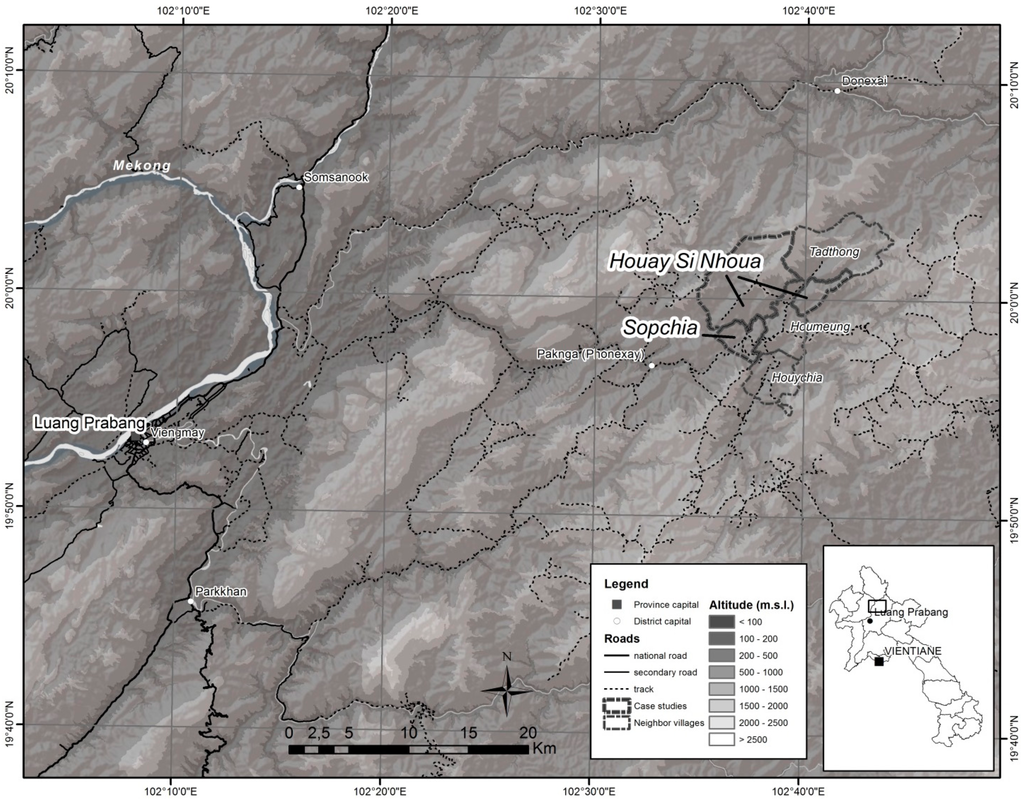 The two surveyed villages are located in the Phonexay district, situated within a travel distance of approximately 63 km of the city of Luang Prabang (Figure 1; Table 1). The district is 80% mountainous with few paddy field areas and a prevalence of rain-fed cultivation on sloping land, and has a poverty incidence of 55% [41]. The first village studied, Sopchia, located approximately 11 km from the district capital, is an ethnically mixed village. It was originally founded in 1914 by ethnic Lao from Xiengkhouang province [42], to which Khmu households immigrated due—among other reasons—to resettlements in nearby villages. It has access to both permanent and upland agriculture areas. The second village, Houay Si Nhoua, is located a little further from the district capital, about 4 km from Sopchia. With more difficult access to markets than Sopchia and a lack of flat areas suitable for paddy, the village is dominated by Khmu ethnic minority households. Originally founded in 1975, the village was resettled in 2003 to a new site (closer to Sopchia) grouping its original population with households coming from two neighboring villages.