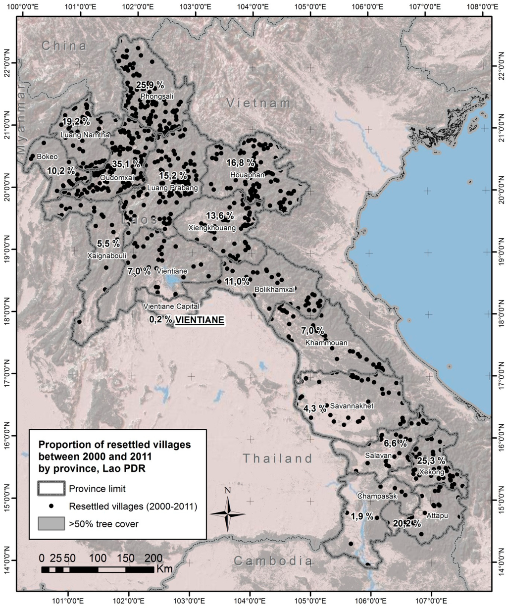 This paper addresses possible relationships between village resettlements and forest cover change in Laos from a multi-scale perspective from the national to the local level. The national assessment builds on the opportunity provided by the release of two important datasets. First, the Lao Census of Agriculture 2010/11 provides a countrywide comprehensive survey on the location of villages that were resettled between 2000 and 2011, as well as information on agricultural populations, living conditions, and agricultural practices in these villages. Second, the Global Forest Change 2000–2012 dataset released by Hansen et al. [13] provides a worldwide, high-resolution account of forest loss and gain between 2000 and 2012. The comparable timeframe of both datasets provides an opportunity to assess the relationship between resettlements and forest cover change at a national scale. A review of existing case studies as well as an original case study were then performed in order to refine the interpretation of the national data.