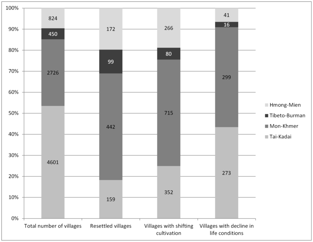 Figure 3 shows the distribution of resettled villages as well as villages reported to practice shifting cultivation and to have experienced a decline in living conditions, in relation to the aggregated four ethnolinguistic families. Resettled villages exist among the four main ethnolinguistic families. However, minorities (non-Tai-Kadai) are indeed clearly overrepresented in resettled villages. About 50% of resettled villages but only 30% of all villages have populations dominated by Mon-Khmer ethnic groups. Inversely, only 20% of resettled villages but more than 50% of all villages are dominated by Tai-Kadai groups.