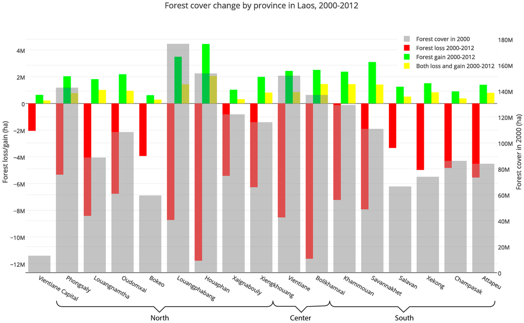 Figure 4 shows forest cover, loss and gain by province, derived from the Hansen et al. [13] dataset. Many Northern provinces still have significant forest cover. The largest amount of lost forest can be found in the provinces of Houaphan, Bolikhamxai, Vientiane, Luang Prabang and Luang Namtha. On the other hand, Houaphan and Luang Prabang show the largest amount of forest regrowth. In general, Northern provinces show both high forest loss and forest gain.