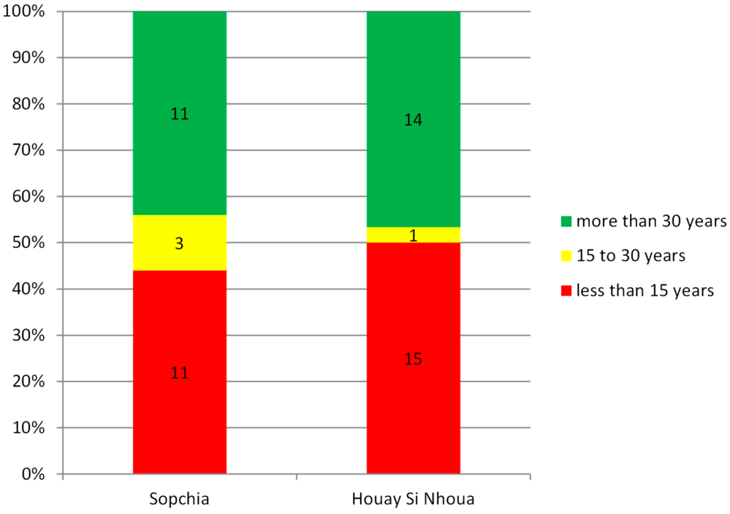 By 2013, around half of the 55 surveyed households from Sopchia and Houay Si Nhoua had lived for less than 15 years in the two villages, while nearly the other half were living there for more than 30 years (Figure 7). The household survey found land access to be highly unequal between original settlers and newcomers, especially regarding access to highly productive paddy rice land in the case of Sopchia: 64% of the households who had access to paddy rice land had been living for more than 20 years in the village, 18% between 10 and 20 years, and only 18% had resided there for less than 10 years. This shows that newcomers are unlikely to get access to highly productive, irrigated land [41].