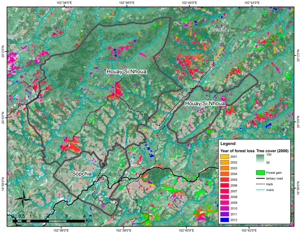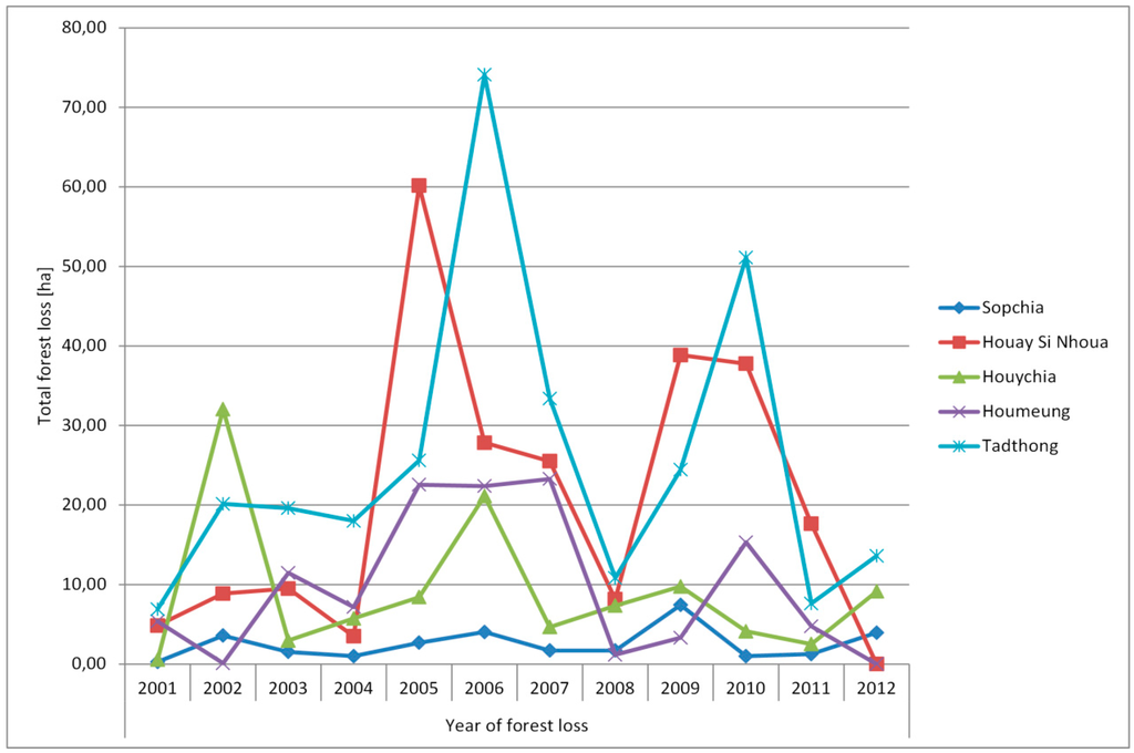 Considering the yearly forest loss since 2001 of both villages, as well as in the neighboring villages of Houychia, Houmeung and Tadthong (see also Figure 1), we observe a similar pattern, except for Sopchia, which performed LUP in 1999 (Figure 9). The villages of Tadthong and Houychia have also been resettled, but not Houmeung. Though we do not have information on when LUPLA was performed in all villages, the village of Tadthong shows the same timing for peaks of forest loss as Houay Si Nhoua, which corresponds to a period after which villagers returned to their original homes.