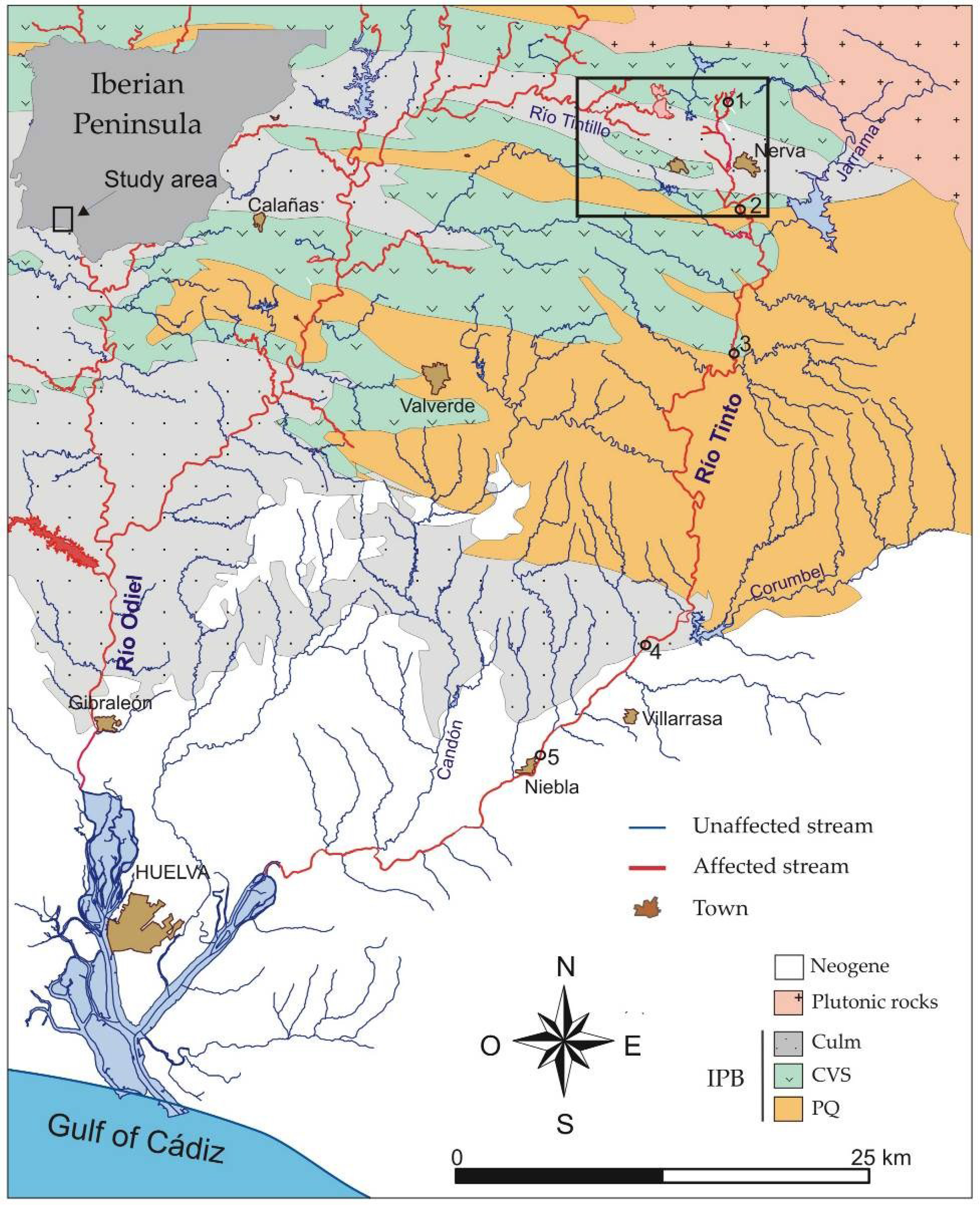 The Río Tinto basin drains mainly materials belonging to the Iberian Pyrite Belt (IPB), which in turn forms part of the South Portuguese Zone of the Hercynian Iberian Massif. Only in the southern part of the watershed the river runs through Neogene materials, mainly marly deposits (Figure 1). The IPB, a 230 km long by around 50 km wide strip extending from the Seville province to the southwest of Portugal, comprises three lithological groups from Devonian to Middle Carboniferous [6]: (1) the Phyllite-Quartzite Group (PQ), formed by a sequence of shales and sandstones with an estimated thickness of at least >2000 m [7], (2) the Volcano-Sedimentary Complex (VSC), which overlies the PQ group and includes a mafic-felsic volcanic sequence interstratified with shales, and (3) the Culm Group, overlying the VSC, a turbidite sequence of shales, sandstones and conglomerates.