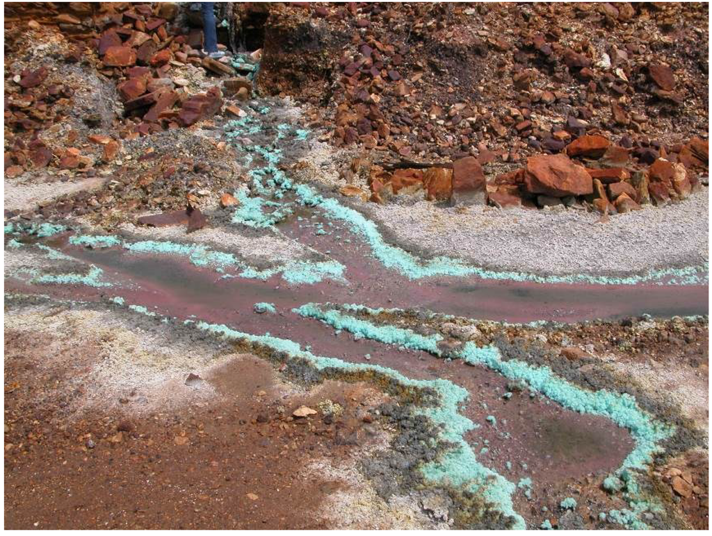 Evaporitic sulphate salts at the toe of a spoil heap in the Río Tinto mine. These salts were collected in the summer since the Middle Ages for the manufacture of dyes and other uses.