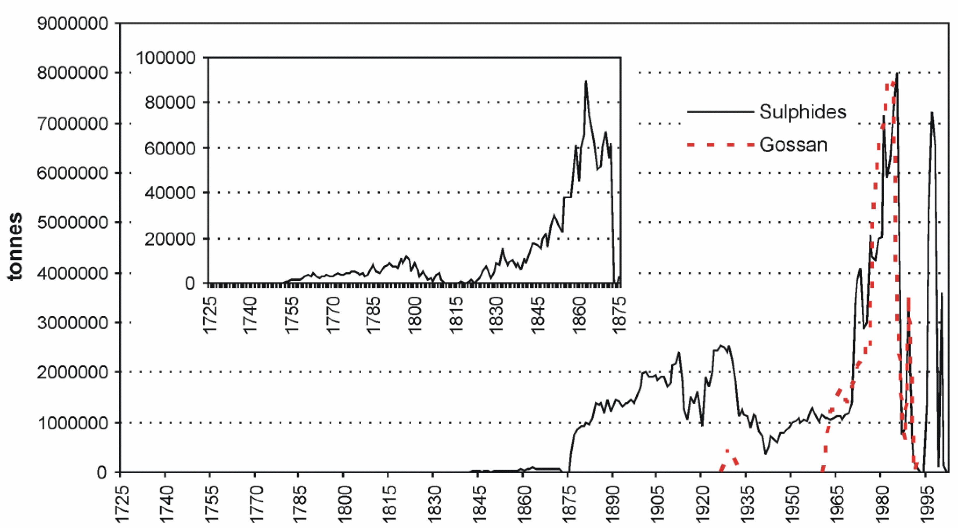 Evolution of sulphide and gossan production (run-of-mine ore) in the Río Tinto mine from the eighteenth century to the present.