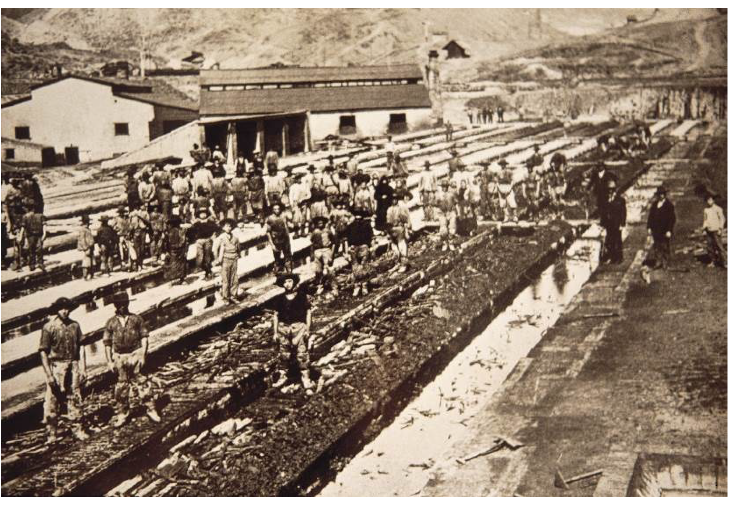 Production at the Río-Tinto mine fell in the early nineteenth century (Figure 4) due to poor management, until completely paralysed during the Spanish War of Independence (1808–1814). To improve the performance of the mines, a concession was made to the Marquis of Remisa (1829–1849), who moved production into growth (Figure 4). New smelters, that needed significant amounts of wood and caused the disappearance of the surrounding trees, were constructed. In 1839, calcinations in “teleras” began to be used for the low grade Cu ores. This method involved the slow roasting (over six to seven months) of 40–50 tonnes of ore in conical heaps to remove the sulphur. Then, the roasted ore was placed in tanks with acidic water to dissolve the copper and cementation then produced copper in contact with iron scrap in channel systems (Figure 5). The calcination “teleras” meant less wood consumption [35]. Mineral extractions were restricted to the underground mining of a small area in the South Lode (Figure 6), distributed in six floors, reaching a maximum depth of 64 m, less than that reached by the Romans [36]. Production in 1850 was 25,000 t of sulphides (Figure 4).